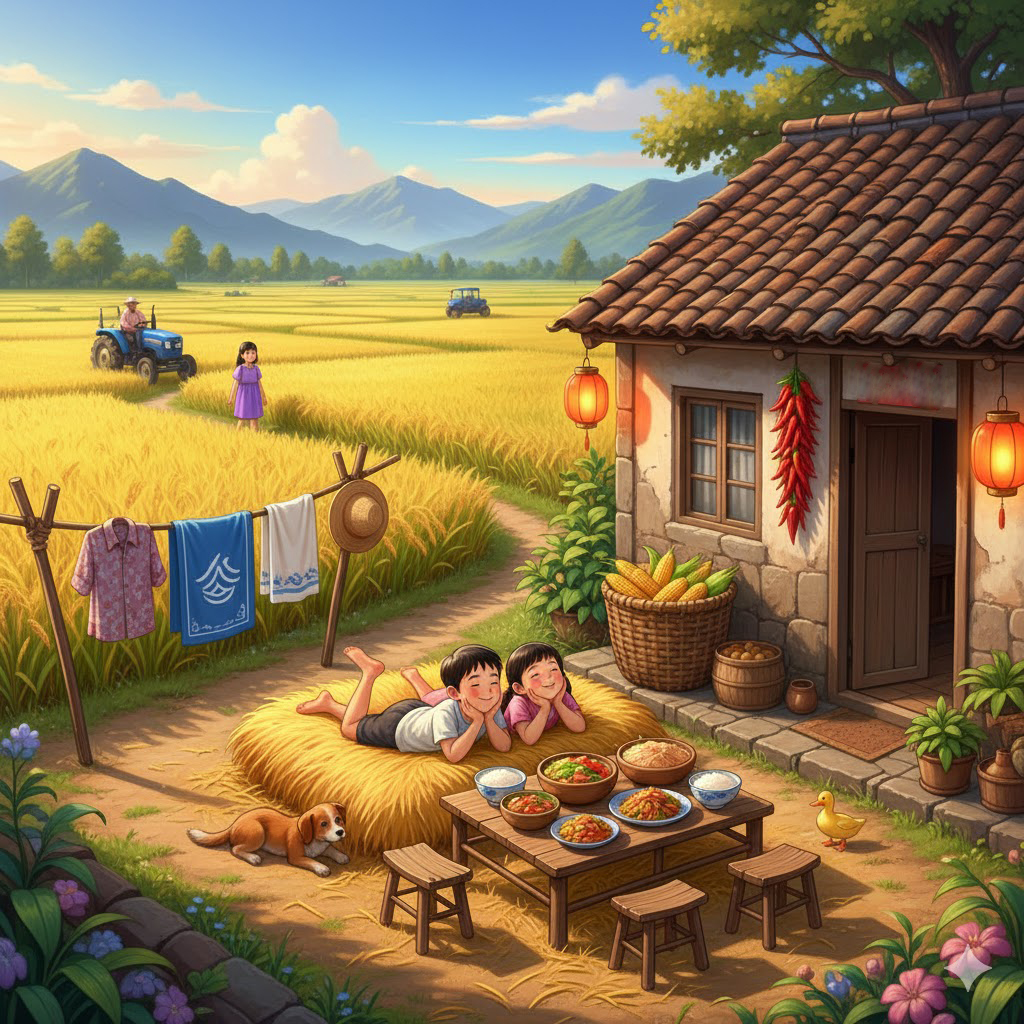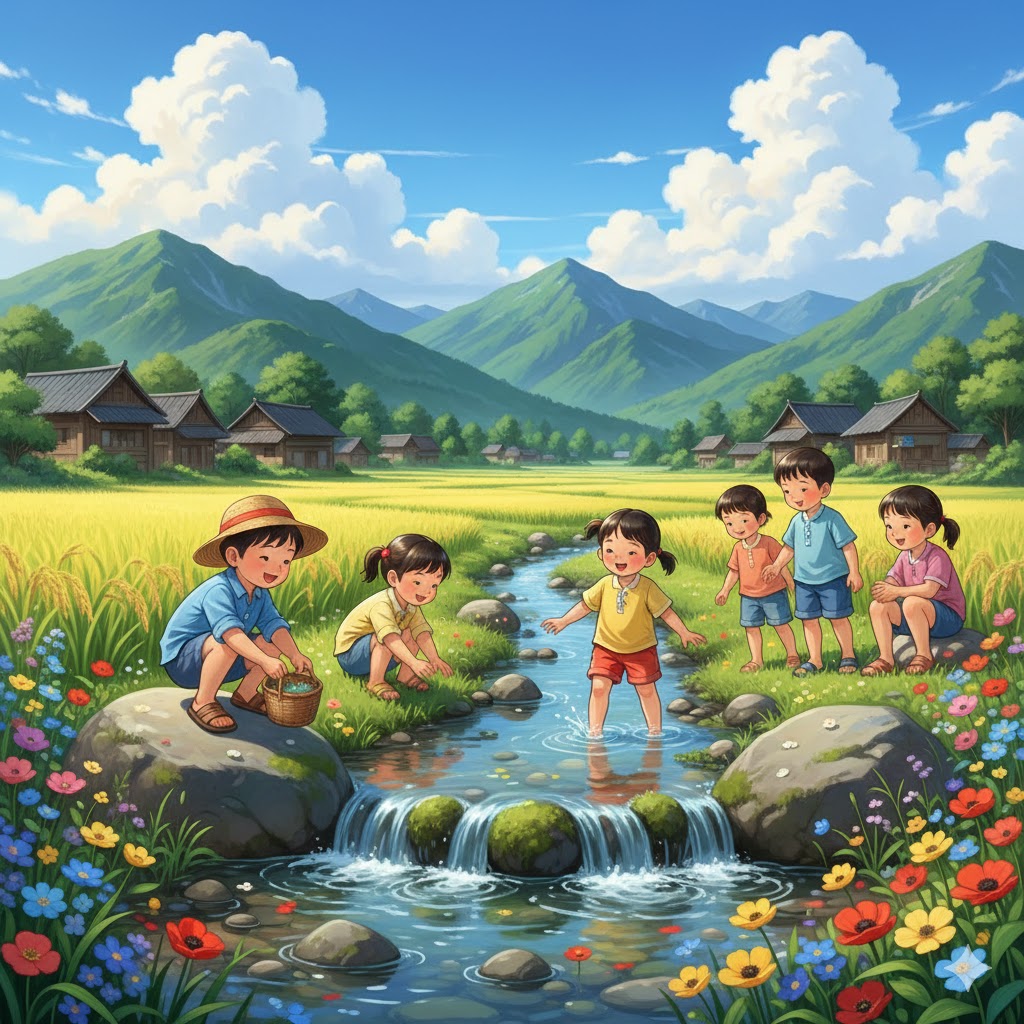 황금빛 논 뒤편으로는 나무집들이 줄지어 서 있고, 파란 산이 마을을 포근히 감싸안고 있습니다. 개울가에 핀 노란 꽃, 분홍 꽃, 파란 꽃들이 아이들의 즐거움을 함께 축하하는 듯합니다.