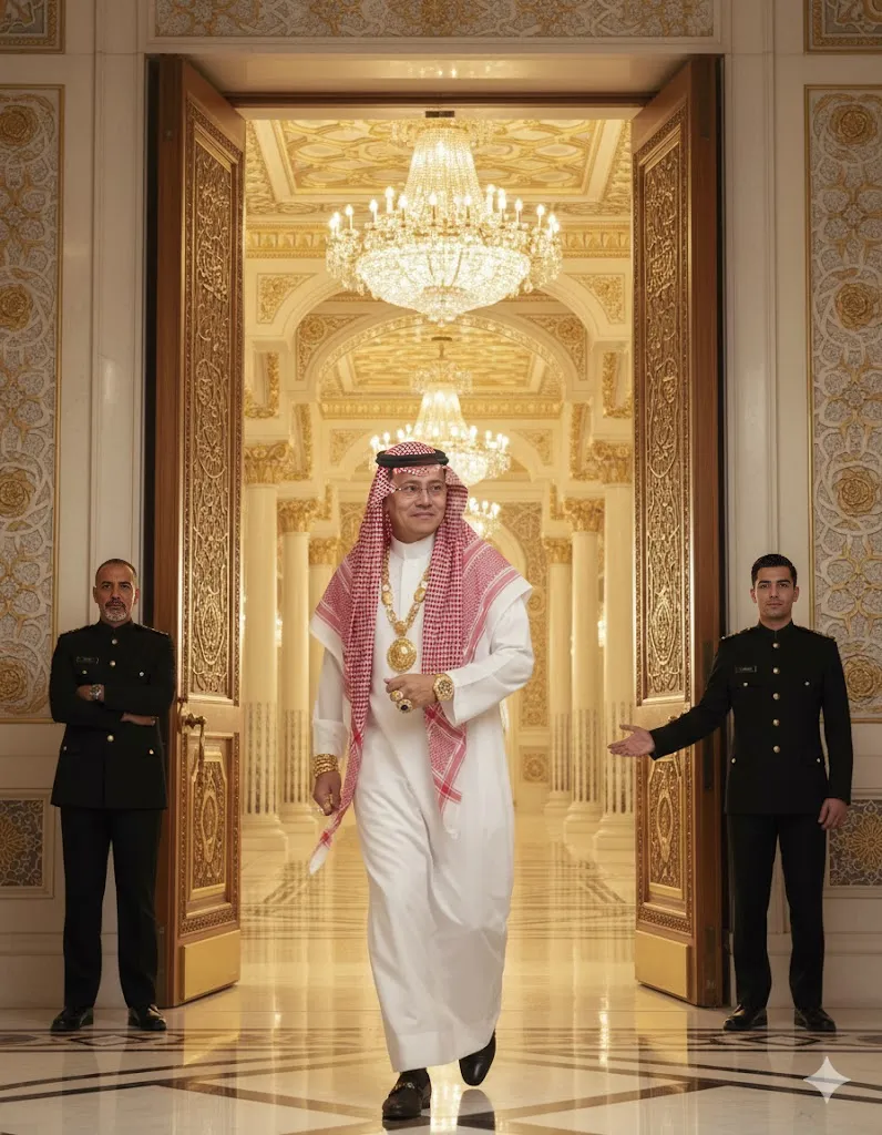 궁전의 문이 열리는 순간, 눈이 부셨습니다. 천장까지 이어지는 황금빛 장식, 수백 개의 크리스털이 반짝이는 샹들리에, 그리고 대리석 바닥에 비친 빛의 향연. 이것이 바로 중동의 환대, '디아파(ضيافة)'의 시작이었습니다.