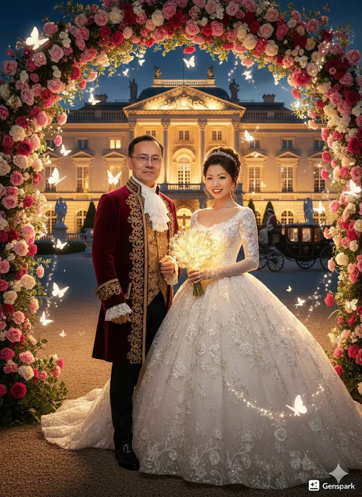 수백 송이의 장미와 국화로 장식된 아치가 우리를 감싸 안았고, 하얀 나비들이 길을 밝혀주었어요. 그녀의 티아라가 조명에 반짝일 때마다, 나는 내가 진짜 왕자가 된 것 같은 기분이었죠.