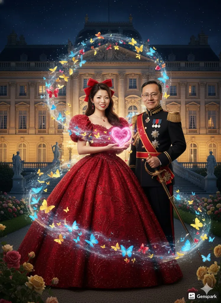 그날 밤, 궁전 전체가 우리의 사랑으로 물든 것 같았어요. 형형색색의 나비들이 아치를 이루며 날아오를 때, 그녀의 빨간 드레스가 마치 불꽃처럼 타오르는 것 같았죠.