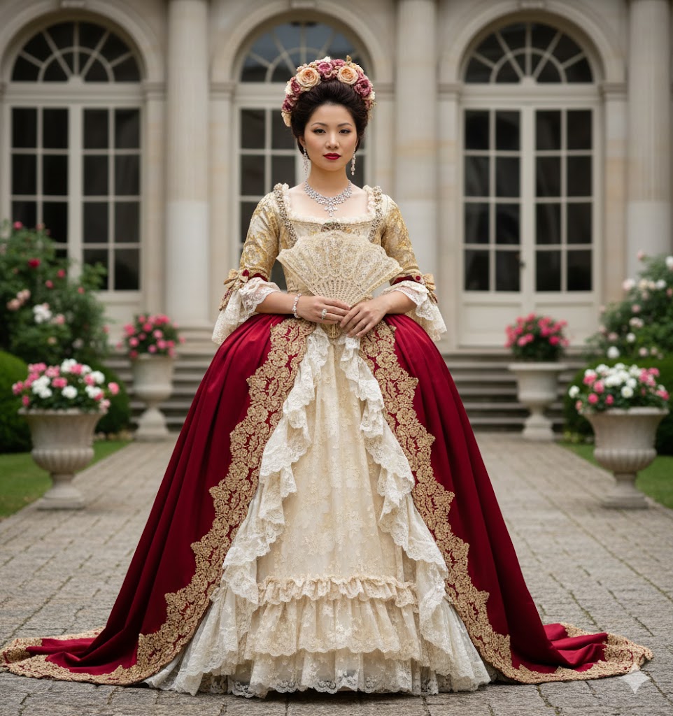 크림색 레이스와 딥 레드 벨벳의 조합은 왕실의 위엄을 표현합니다. 금빛 자수가 돋보이는 이 드레스는 궁전 앞에서 더욱 빛을 발하죠. 부채를 든 손의 우아한 자세 하나하나가 귀족 교육의 정수를 보여줍니다.