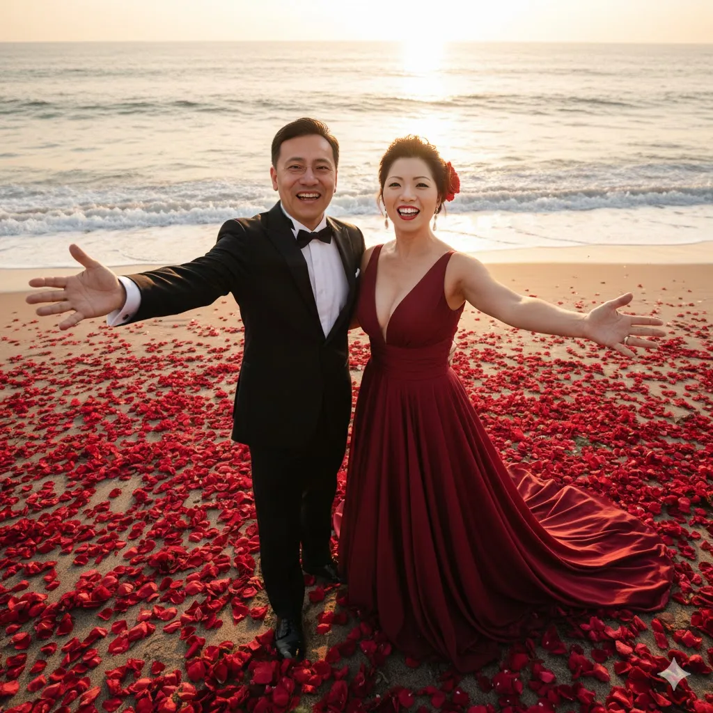 붉은 장미 꽃잎이 황금빛 모래 위에 흩뿌려진 해변. 석양의 부드러운 빛이 파도와 함께 춤추는 그곳에서, 두 사람은 활짝 웃으며 팔을 벌립니다. 검은 턱시도와 와인색 드레스는 세월을 함께한 부부의 우아함을 보여주고, 그들의 미소 속에는 젊은 날의 설렘과는 다른, 깊이 있는 행복이 담겨 있습니다.