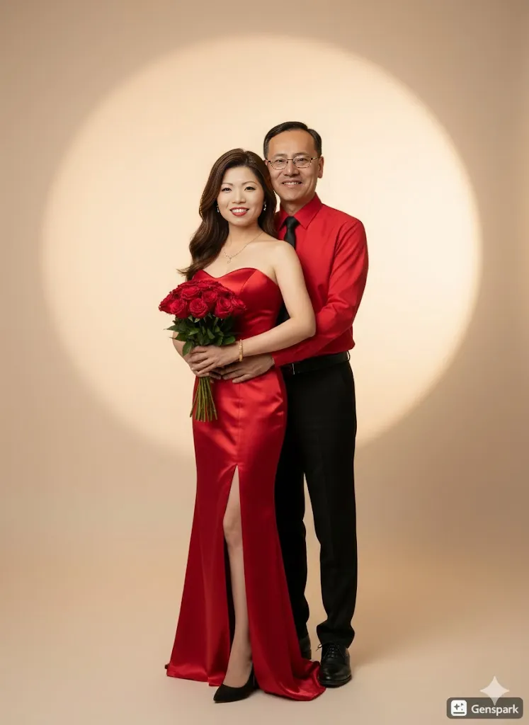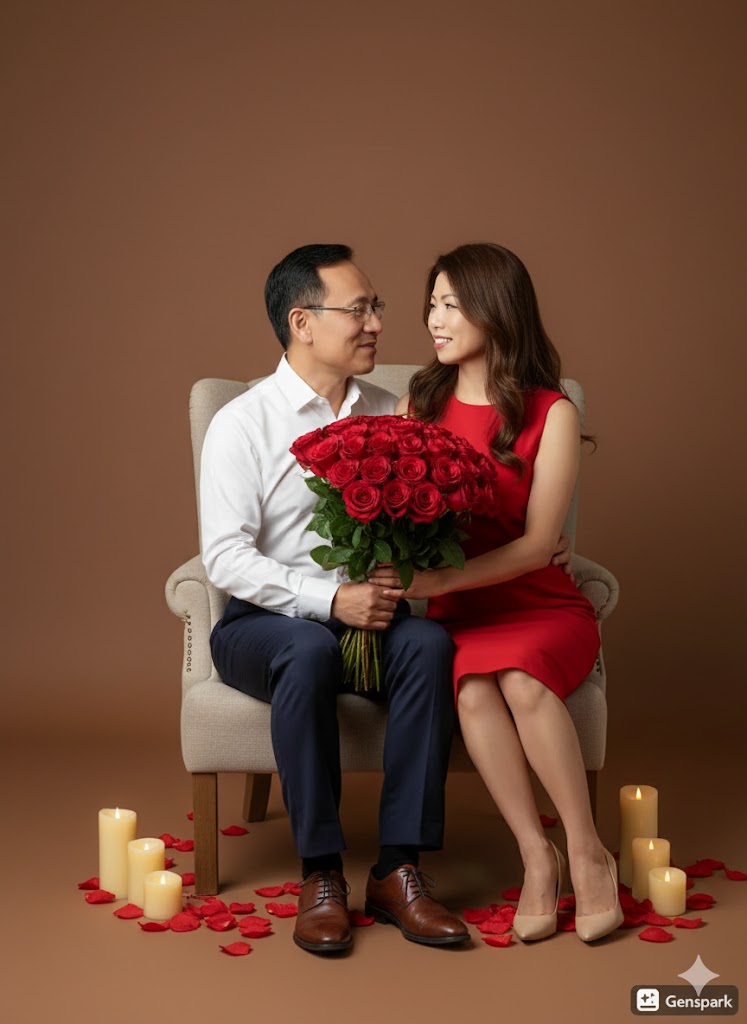 따뜻한 조명 아래, 붉은 장미 한 다발을 사이에 두고 서로를 바라보는 두 사람. 붉은 드레스와 셔츠는 여전히 뜨거운 그들의 사랑을 상징합니다. 나이가 들어도 변하지 않는 것이 있다면, 그것은 상대방을 향한 진심 어린 마음일 것입니다.