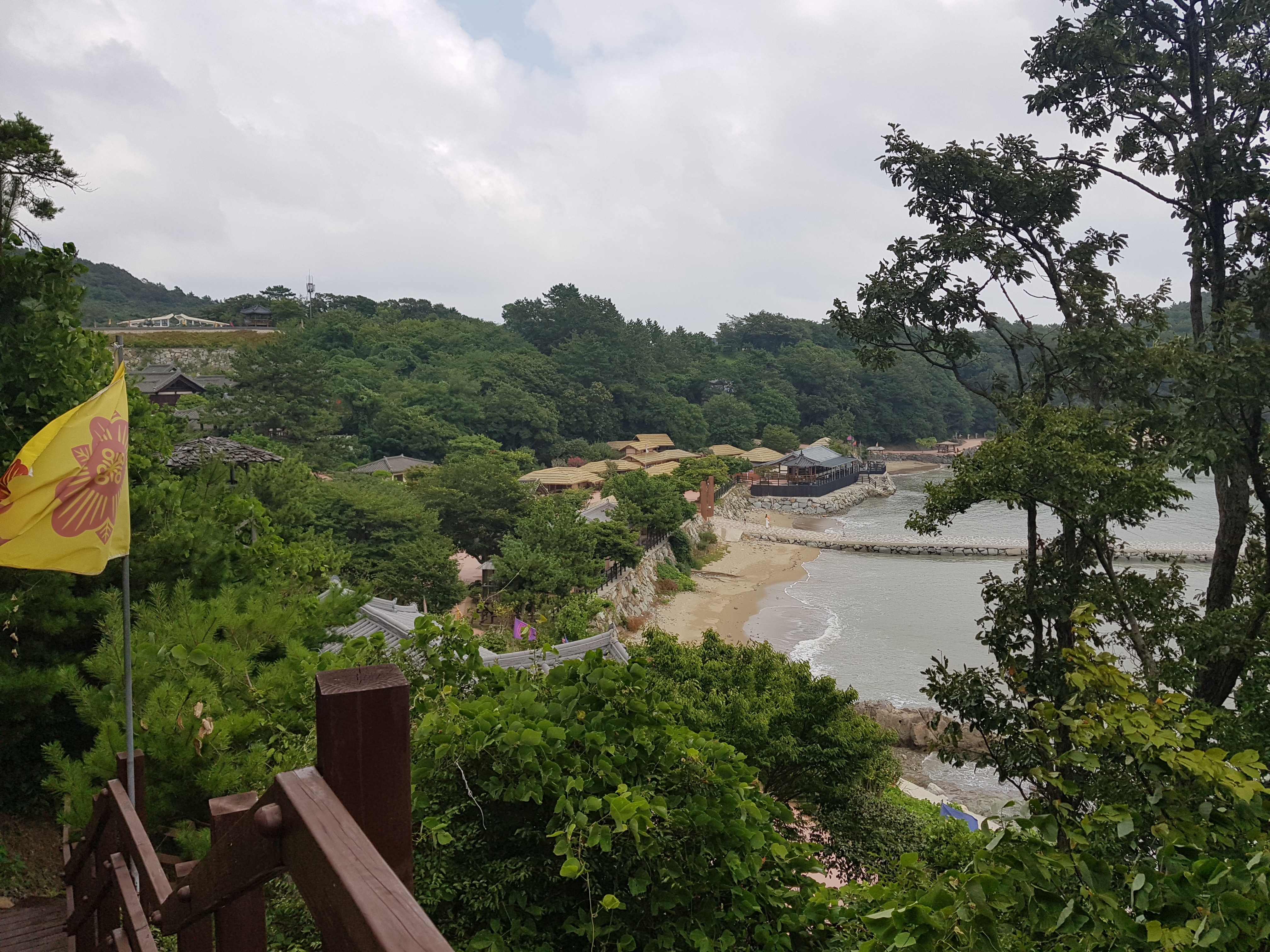 타워에서 내려와 찾아간 곳은 완도의 해안가였습니다. 언덕 위에서 내려다본 전통 한옥 마을과 조용한 해변의 조화는 시간이 멈춘 듯한 평화로움을 선사했습니다. 노란 깃발이 바람에 나부끼고, 초록 나무들 사이로 보이는 기와지붕들. 이곳이 드라마 세트장이라는 사실이 무색할 만큼, 풍경은 그 자체로 완벽한 한 폭의 그림이었습니다.