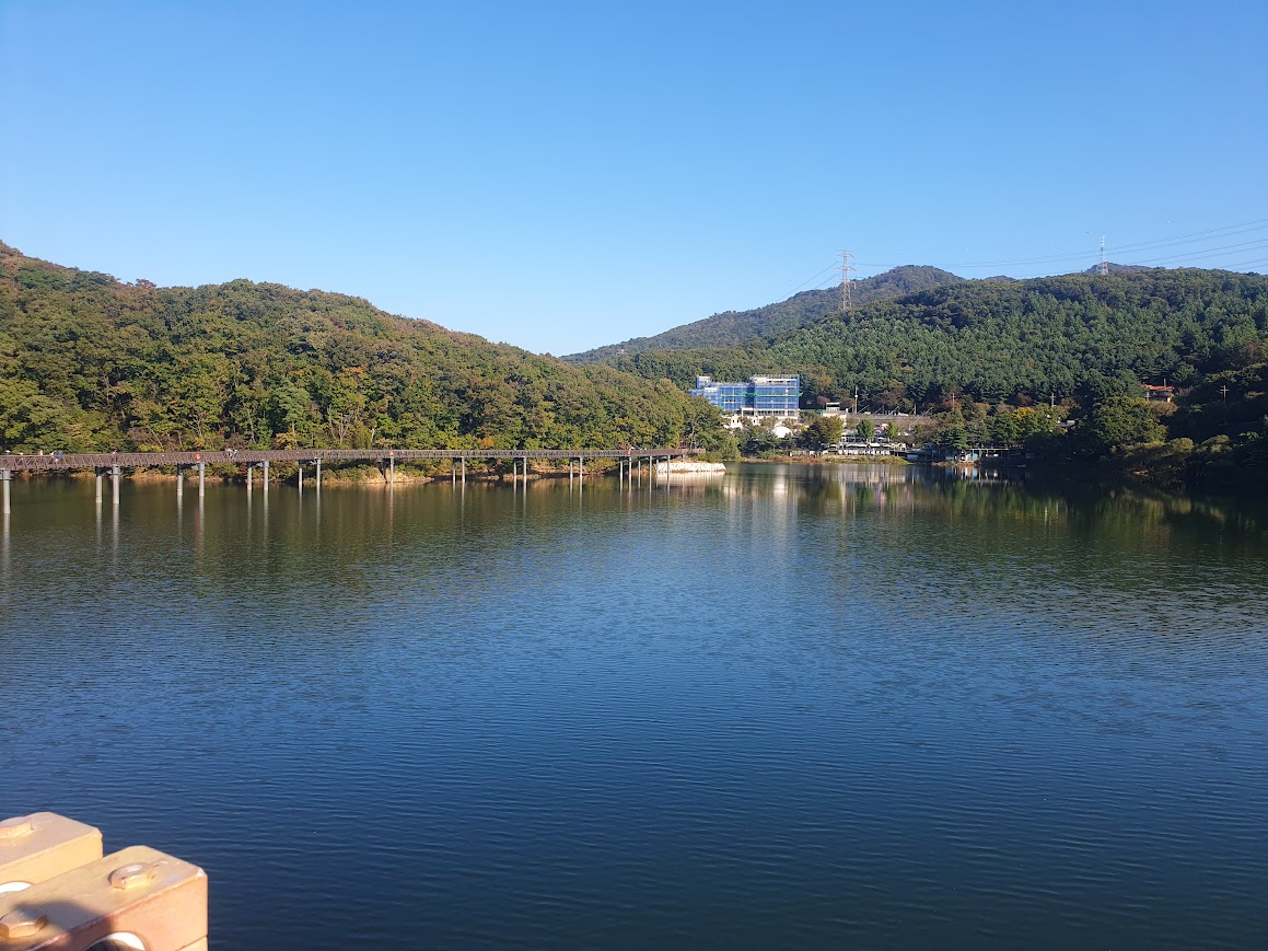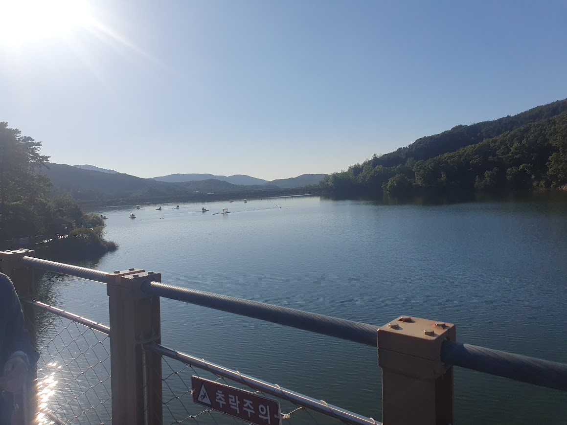 마장호수의 하이라이트는 단연 호수 위를 가로지르는 출렁다리입니다. 나무 데크로 이어진 다리 위를 걸으며 양옆으로 펼쳐지는 호수와 산의 풍경은 한 폭의 수채화 같았습니다. 다리가 살짝 흔들릴 때마다 물 위를 걷는 듯한 기분이 들었고, 저 멀리 수상 레저를 즐기는 사람들의 모습이 평화로운 풍경에 생기를 더해주었습니다.