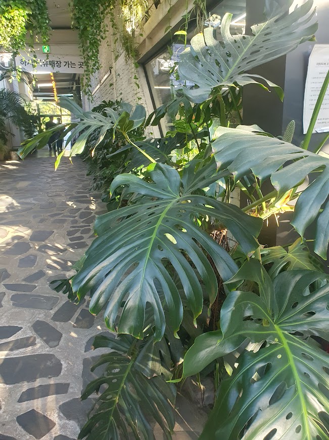 카페 안으로 들어서자 천장까지 닿을 듯한 야자수와 몬스테라, 그리고 이름 모를 열대 식물들이 가득했습니다. 햇살이 유리 천장을 통해 쏟아지고, 그 빛 사이로 식물의 그림자가 춤추는 모습은 마치 작은 열대우림에 온 것 같았습니다. 돌을 깔아 만든 바닥과 자연스럽게 배치된 화분들, 그리고 곳곳에 놓인 의자들은 이곳이 단순한 카페가 아닌 '쉼'의 공간임을 말해주고 있었습니다.
