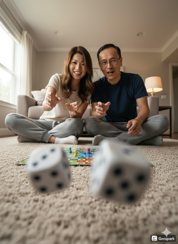 커플이 거실 바닥에서 뱀사다리 게임 중 카메라를 향해 날아오는 거대한 주사위, 극적인 표정, 따뜻한 실내 조명