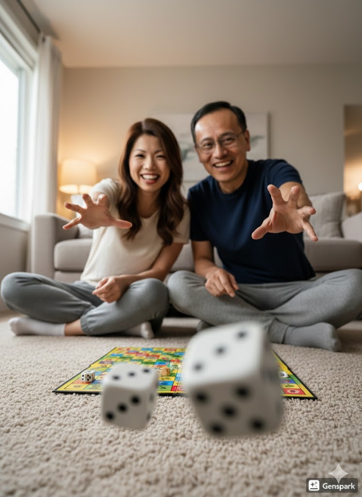 낮은 앵글, 뒹구는 주사위를 향해 손을 뻗는 두 사람, 기대와 긴장이 담긴 밝은 미소, 보드게임 분위기