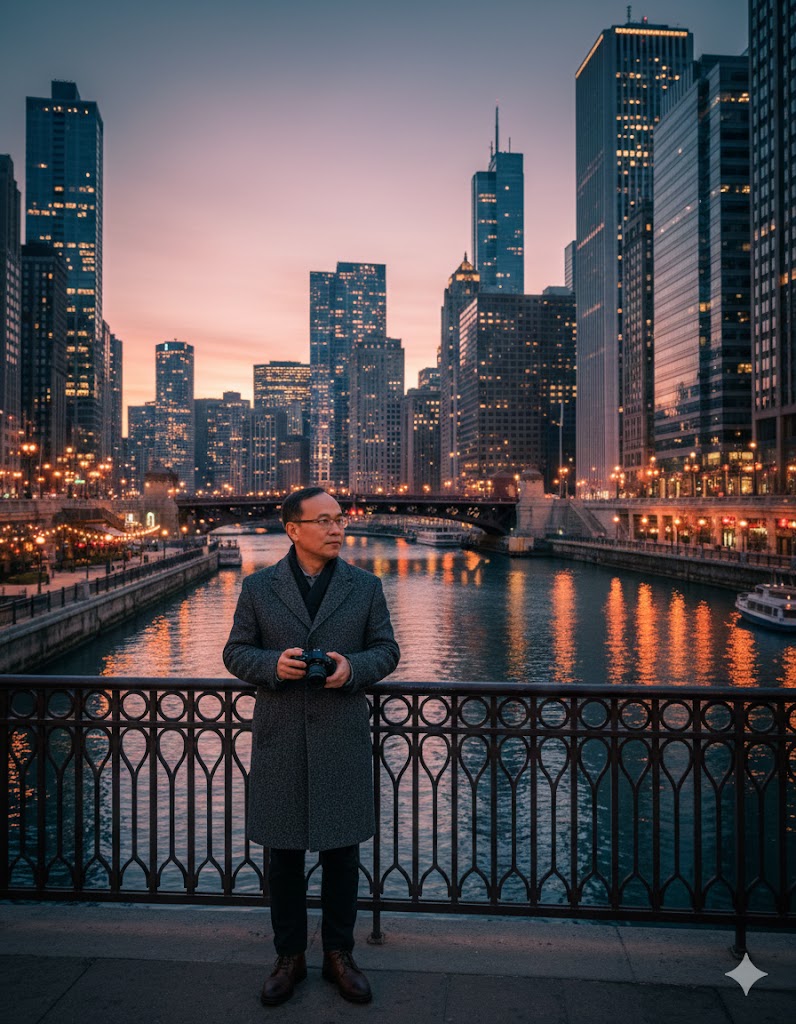 카메라 하나 들고, 라스베이거스 스트립을 황혼 속에 걷는 나. 타임스스퀘어의 블루아워에 홀로 서 있는 나. 시카고 강 위 다리에 기대어 도시의 불빛이 수면에 녹아드는 걸 바라보는 나.