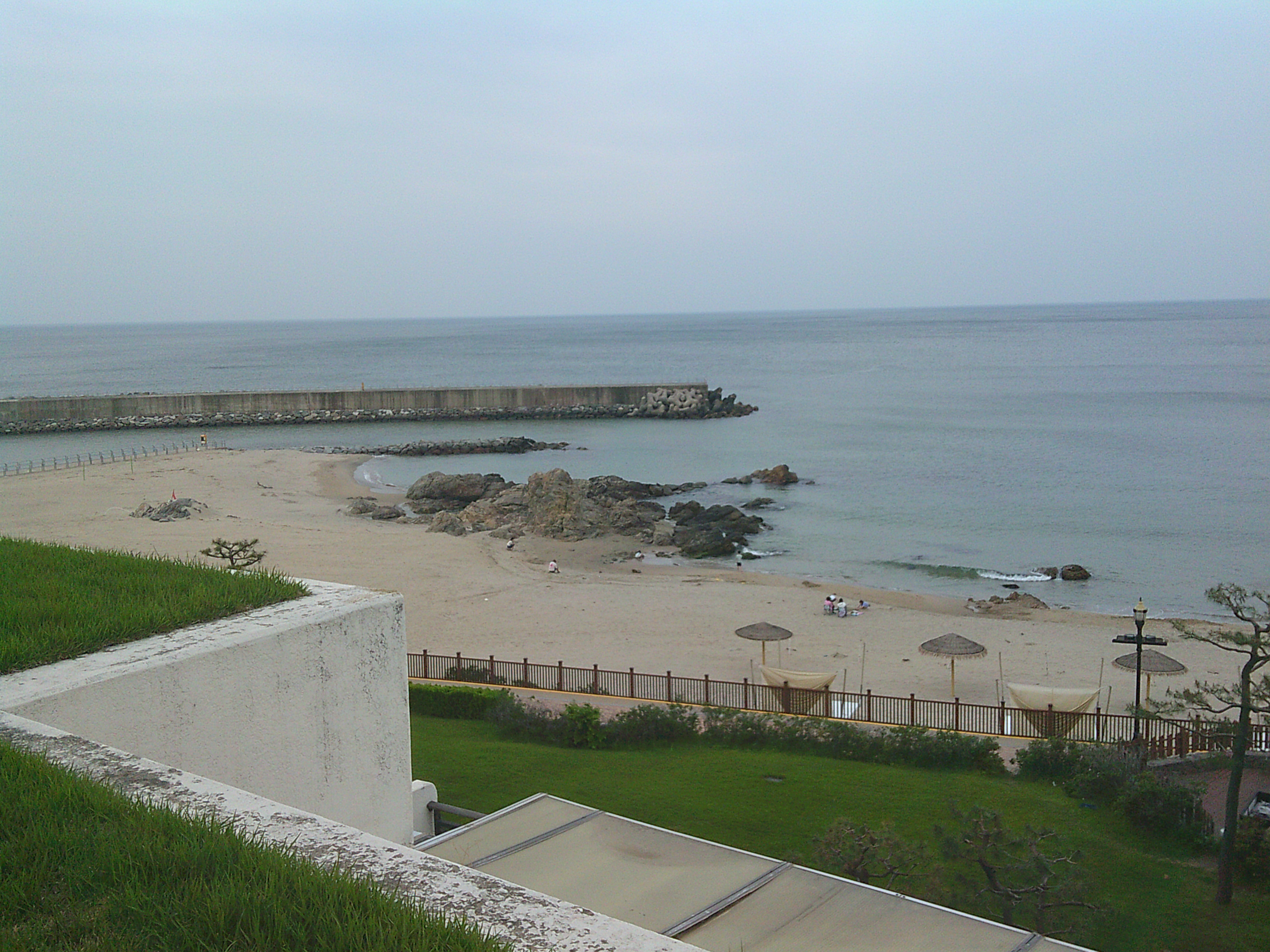 수영장과 백사장, 그리고 그 너머 끝없이 펼쳐진 동해. 저 멀리 초록 솔숲이 바다와 맞닿아 있고, 파란 수영장 물빛이 은은하게 반짝였다. 아직 본격적인 여름 시즌 전이라 한산했지만, 오히려 그래서 더 좋았다. 오롯이 이 공간을 우리만의 것으로 느낄 수 있었으니까.