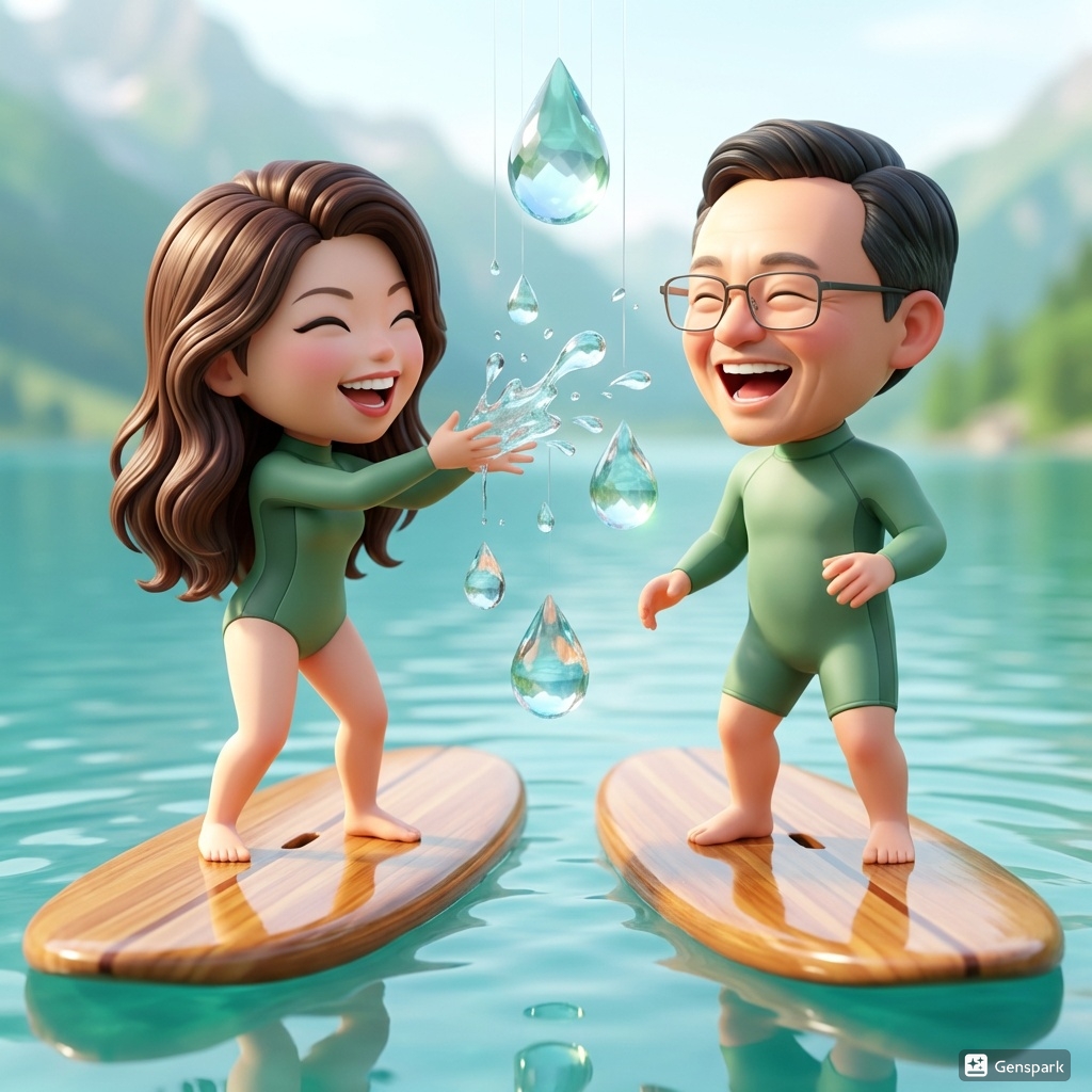 둘 다 초록색 래시가드를 입고, 서로 물을 튀기며 깔깔 웃고 있습니다. 투명한 물방울이 허공에 떠 있고, 배경은 청량하게 맑은 산.