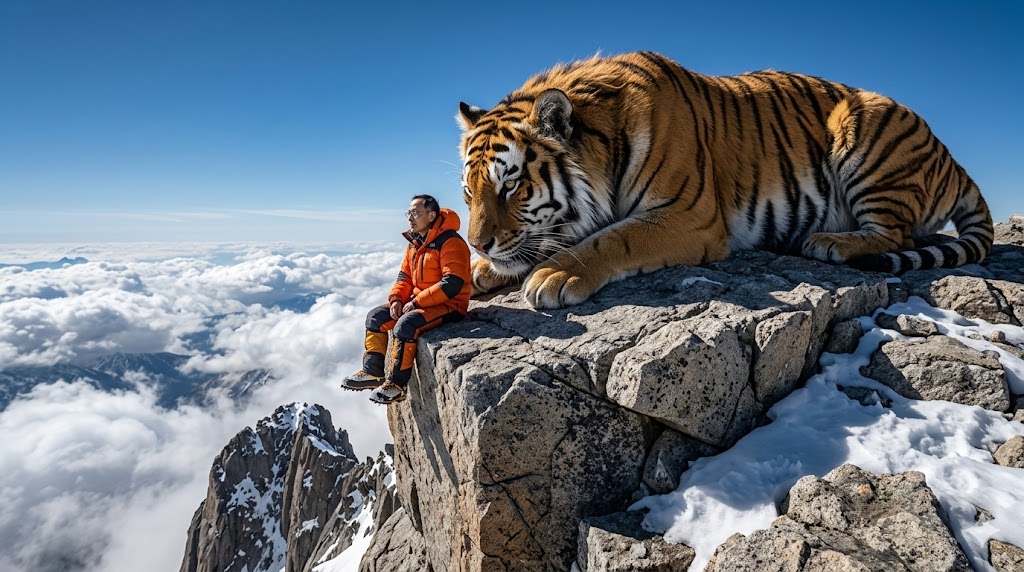 주황색 등산복을 입은 나는 절벽 끝에 앉아 구름 아래 세상을 내려다보고 있고, 바위 위에 여유롭게 엎드린 거대 호랑이는... 나의 호위무사인지 철학적 동반자인지 모르겠지만 완벽한 포스를 풍기고 있다.