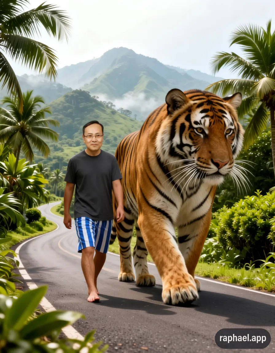 프롬프트 콘셉트: "야자수와 열대 식물이 우거진 산길 도로를 호랑이와 나란히 걷는 남자"