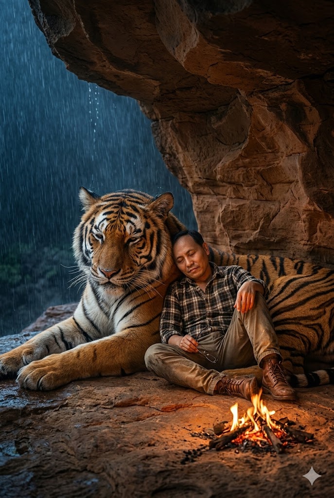 프롬프트 콘셉트: "폭우 속 바위 동굴, 모닥불 옆에서 호랑이에게 기대어 쉬는 남자"