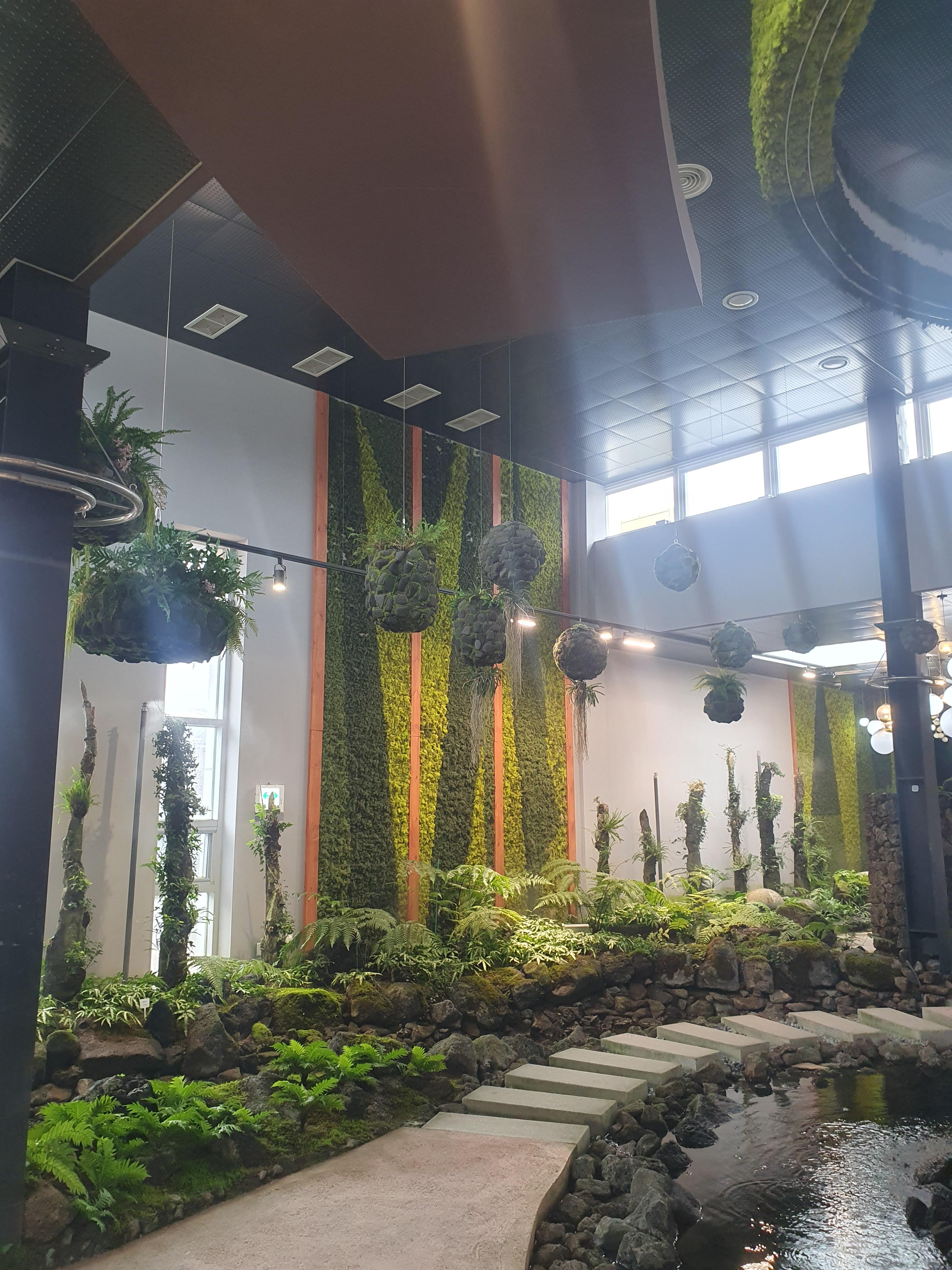 붉은 나무 프레임이 기하학적으로 이끼 벽을 가르고, 그 앞에는 각종 양치식물과 고사리들이 터를 잡았습니다. 천장에는 이끼와 식물로 감싸인 둥근 플랜츠볼들이 줄줄이 매달려, 마치 숲속 행성들이 공중을 유영하는 것 같습니다.