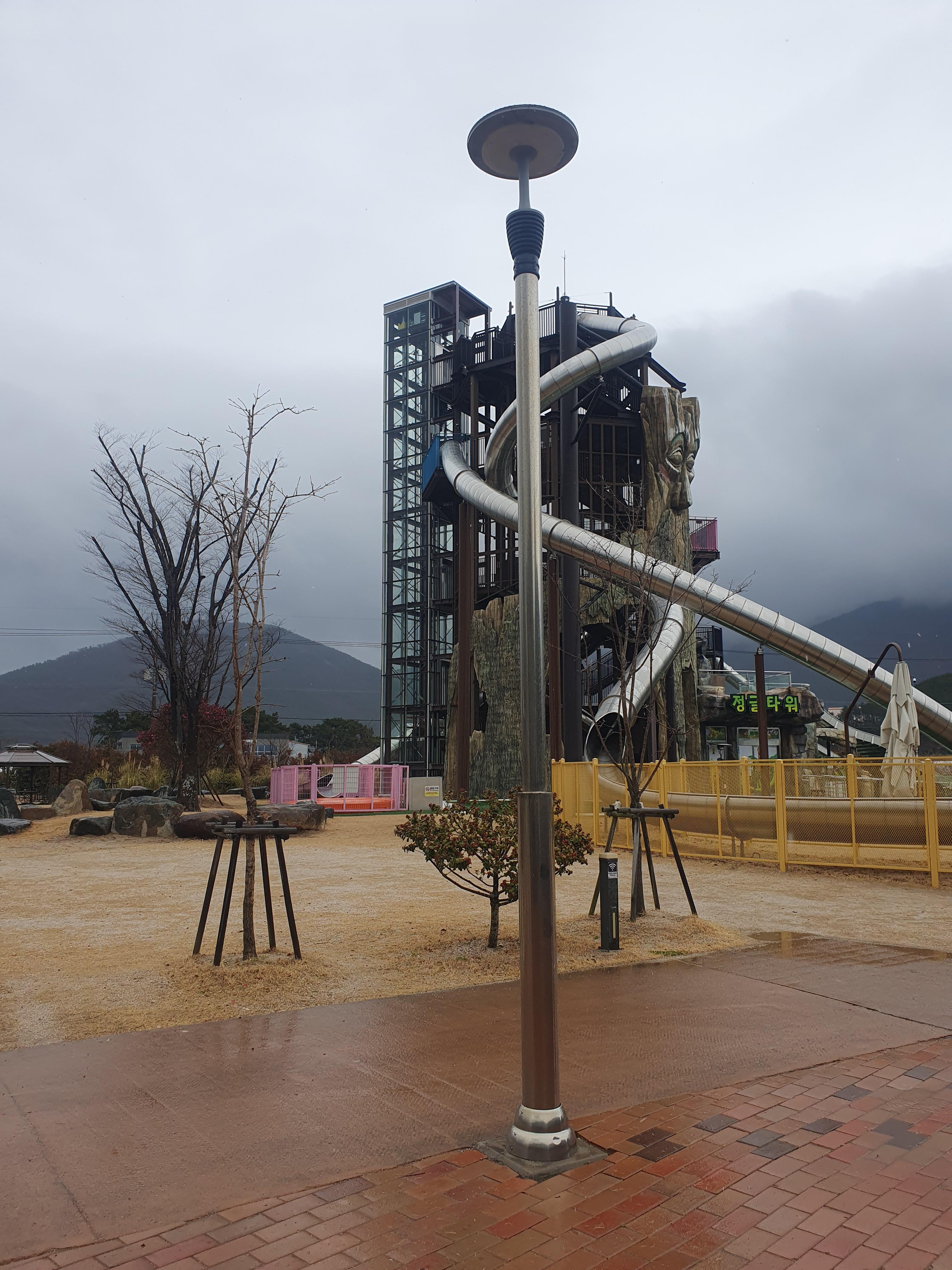 거대한 정글 타워 (정글타워). 나무 조각상과 철제 구조물이 결합된 이 타워는 여러 층을 오르내릴 수 있는 체험형 어드벤처 시설로, 대형 미끄럼틀이 구불구불 내려오는 모습이 압도적입니다. 비가 살짝 내리는 흐린 날씨였지만, 뒤편 거제도의 산줄기와 함께 보이는 타워의 실루엣은 그 자체로 멋진 풍경화였습니다.아이와 함께라면 필수 코스, 어른이라도 동심으로 돌아가고 싶어지는 곳!