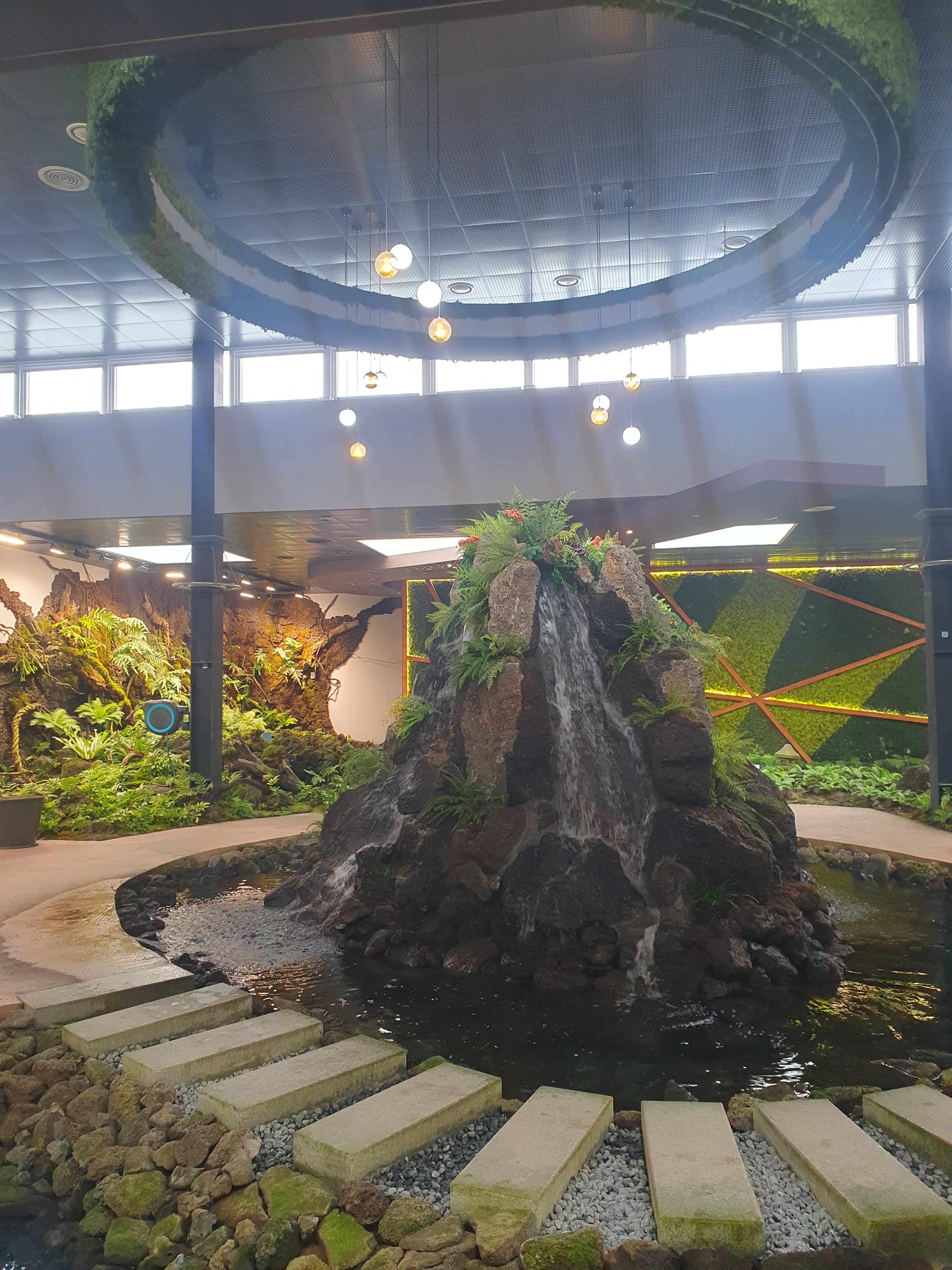 진트리움의 심장부에는 현무암으로 쌓아올린 폭포 조형물이 우뚝 서 있습니다.