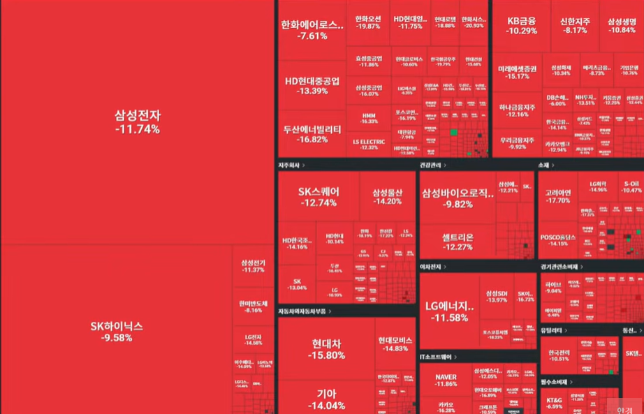 삼성전자와 SK하이닉스는 각각 11%, 9%대 약세를 보였고, 현대차(-15.80%), 기아(-14.04%), HD현대중공업(-13.39%), LG에너지솔루션(-11.58%) 등 대형주 대부분이 급락했습니다. 코스피 상장 종목 중 상승한 종목은 단 13개에 불과했습니다.