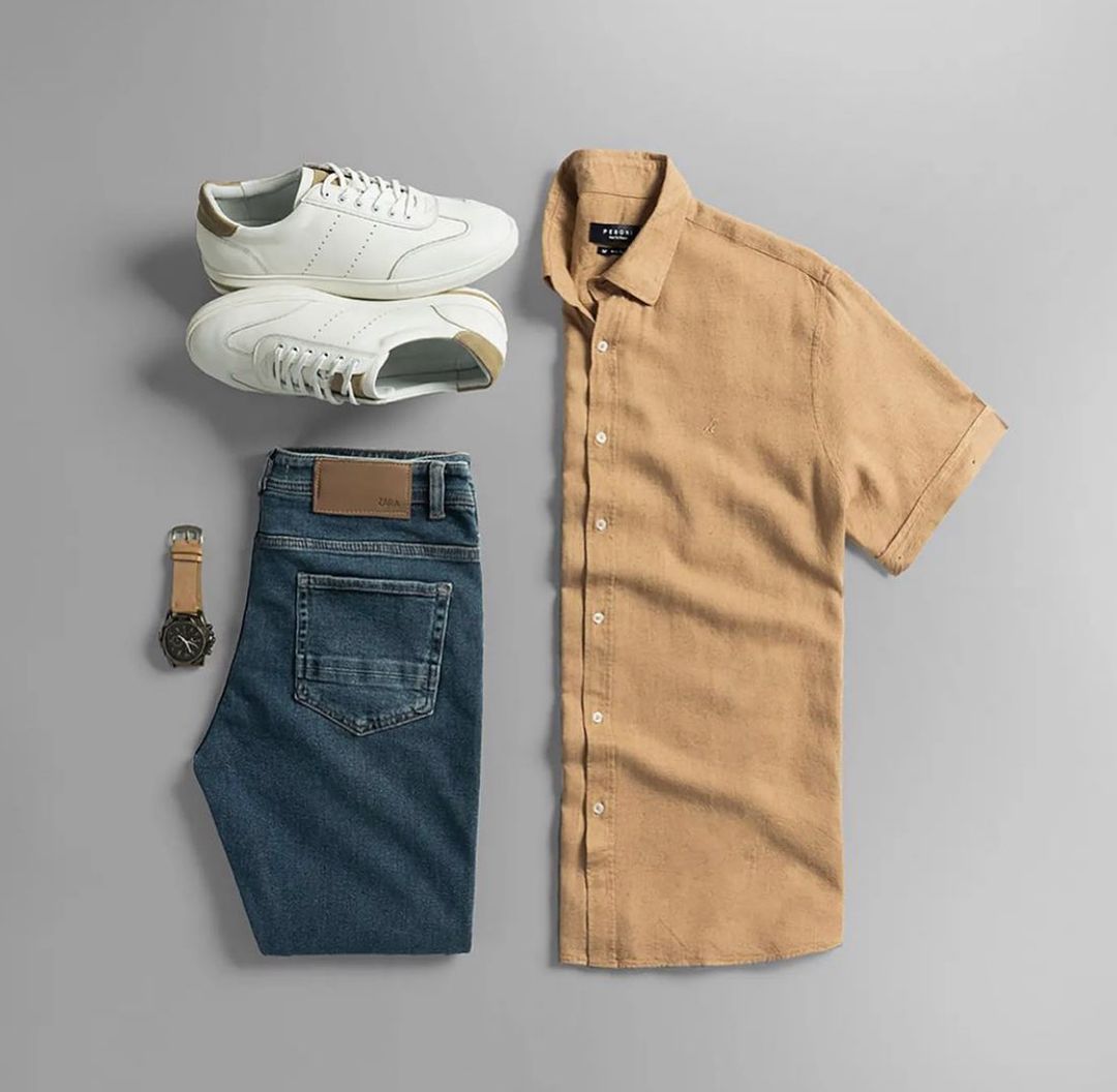 카멜 톤의 리넨 반팔 셔츠는 피부에 닿는 공기처럼 가볍고, 다크 진과의 만남은 이완과 완성 사이의 균형입니다.
