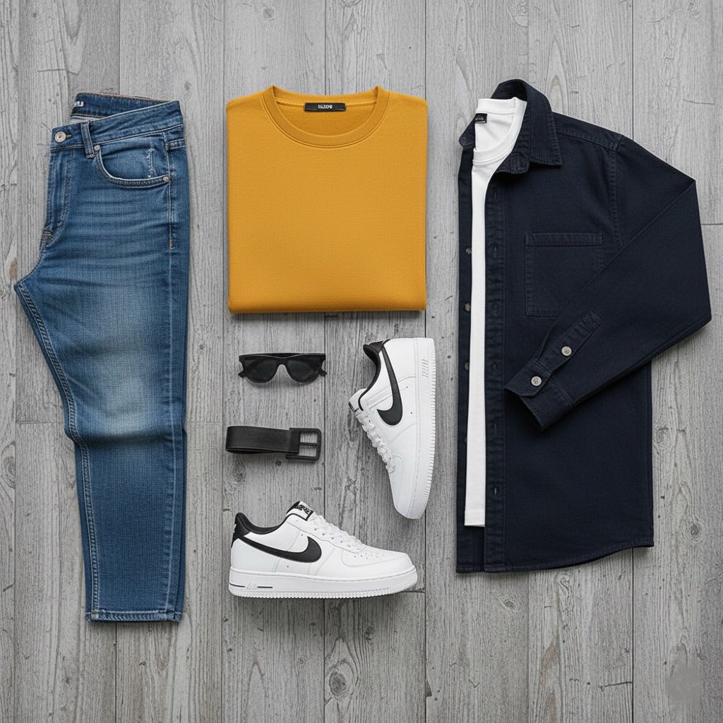 나이키 에어포스 1의 흰 밑창이 걸음마다 경쾌한 리듬을 만들어냅니다. 라이트 블루 데님은 전체 무게를 가볍게 들어올리고, 블랙 벨트 하나가 흐트러질 뻔한 실루엣을 완벽하게 정리합니다.