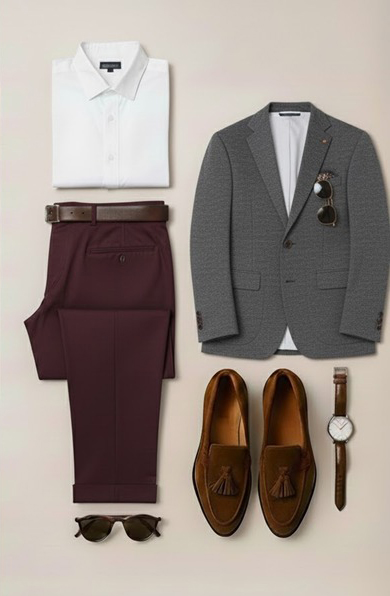 Gray Blazer + Burgundy Trousers