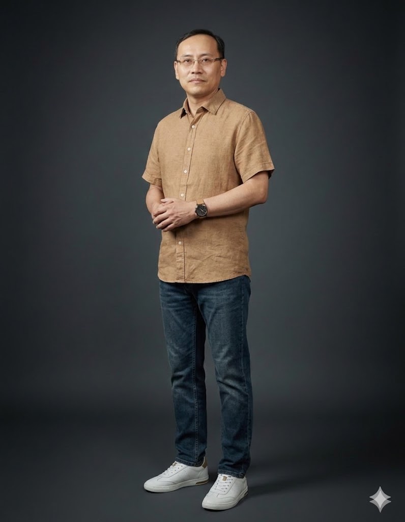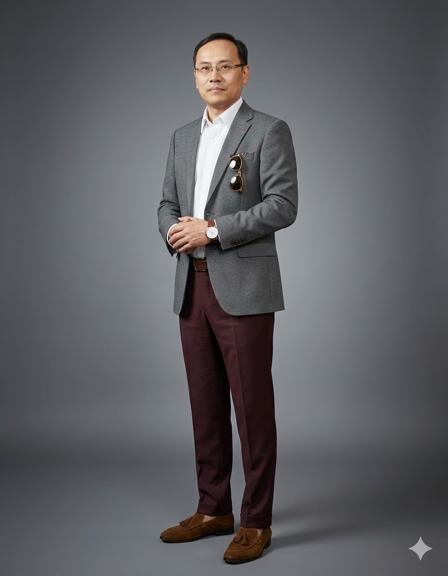 골드 시계가 손목에서 빛납니다 시간을 지키는 사람만이 시간의 아름다움을 안다는 듯이. 브라운 더비 슈즈의 광택이 모든 것을 마침표로 마무리합니다. 이것은 옷이 아니라 하나의 선언입니다.