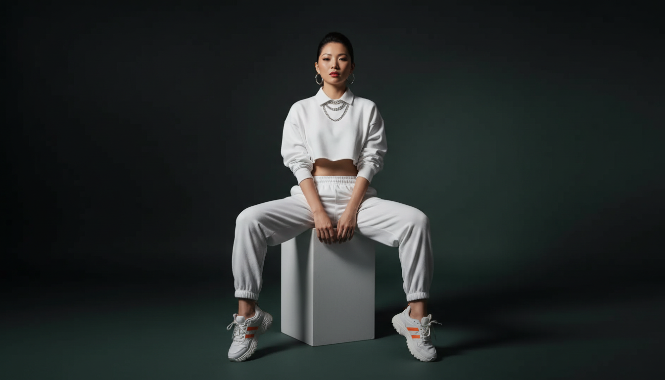 "Asian female model in all-white cropped sweatshirt and white jogger pants, silver chain necklace, white sneakers, sitting on white cube, dark teal studio background, editorial fashion photography, confident direct gaze, dramatic shadows"