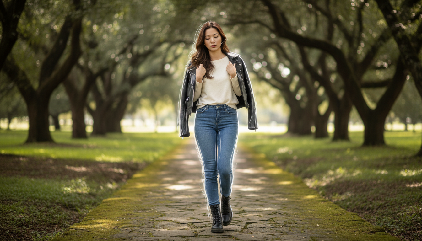 "Woman walking alone on a mossy stone path through a tunnel of ancient oak trees, wearing white top and black leather jacket over jeans and boots, looking down thoughtfully, soft bokeh background, cinematic composition, golden afternoon light"