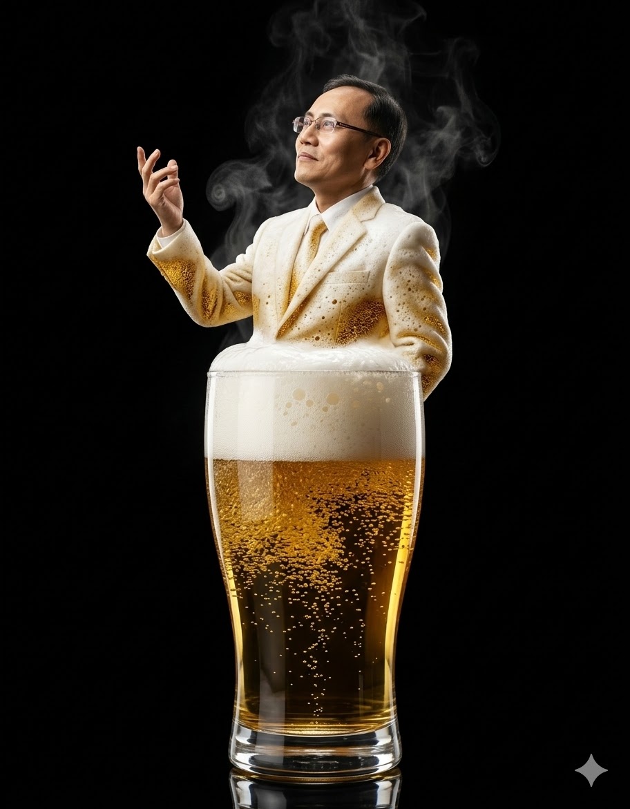 이건 진지하게 보시면 안 됩니다. 맥주잔 속에서 맥주 거품 드레스를 입고 흘러넘치는 여성, 그리고 크림 수트 차림으로 맥주 위로 솟아오르는 점잖은 신사. 이 두 장면은 AI와 제가 함께 낼 수 있는 최고의 유머입니다.