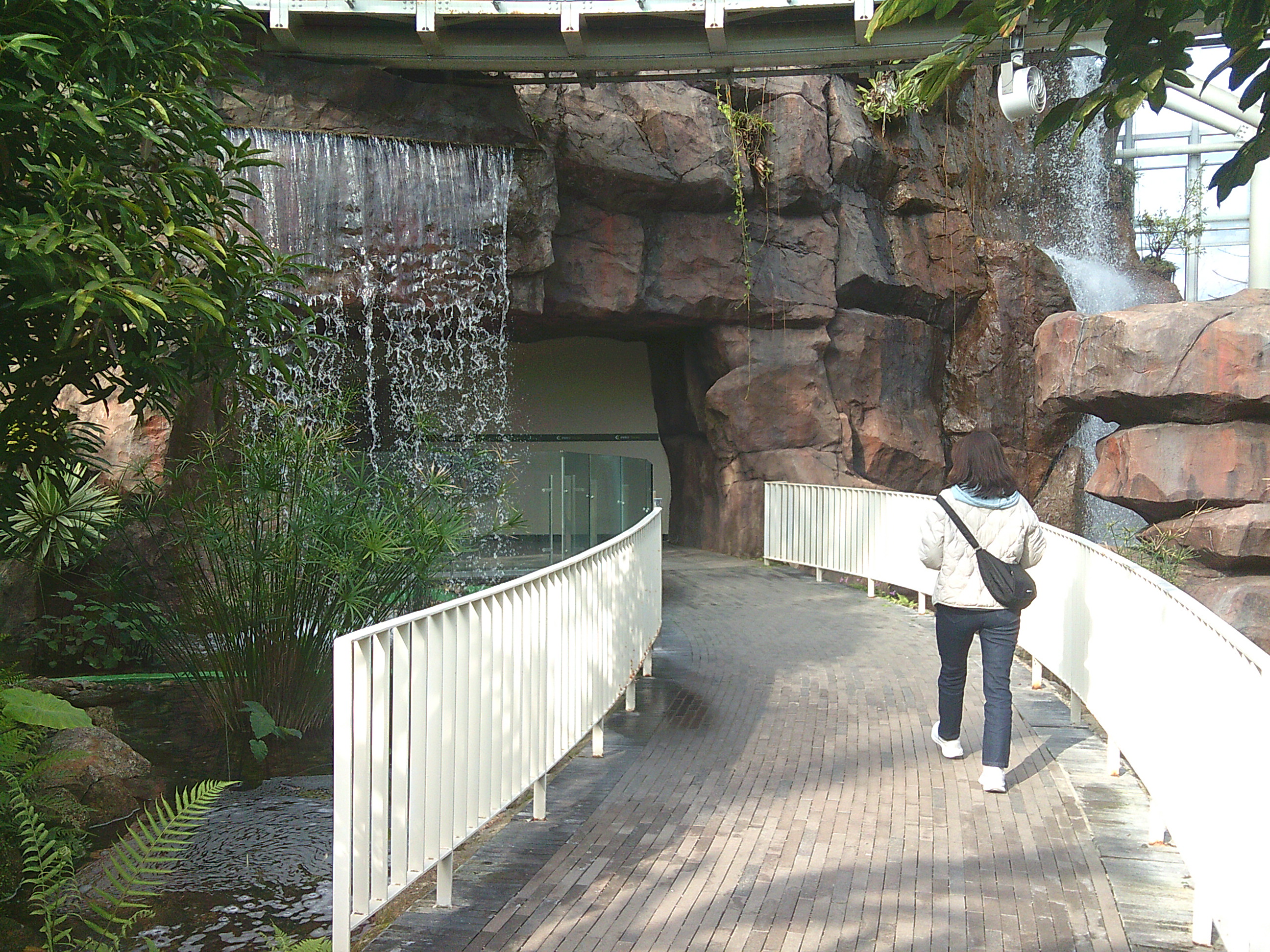 동굴을 빠져나오면 실내외를 잇는 워크웨이(산책 브릿지)가 나오는데, 양 옆으로 인공 폭포가 흘러내리는 거대한 암석 구조물이 맞이해줘요. 웅장한 폭포 소리를 들으며 걷는 이 구간은 마치 자연 협곡을 탐험하는 느낌이에요.
