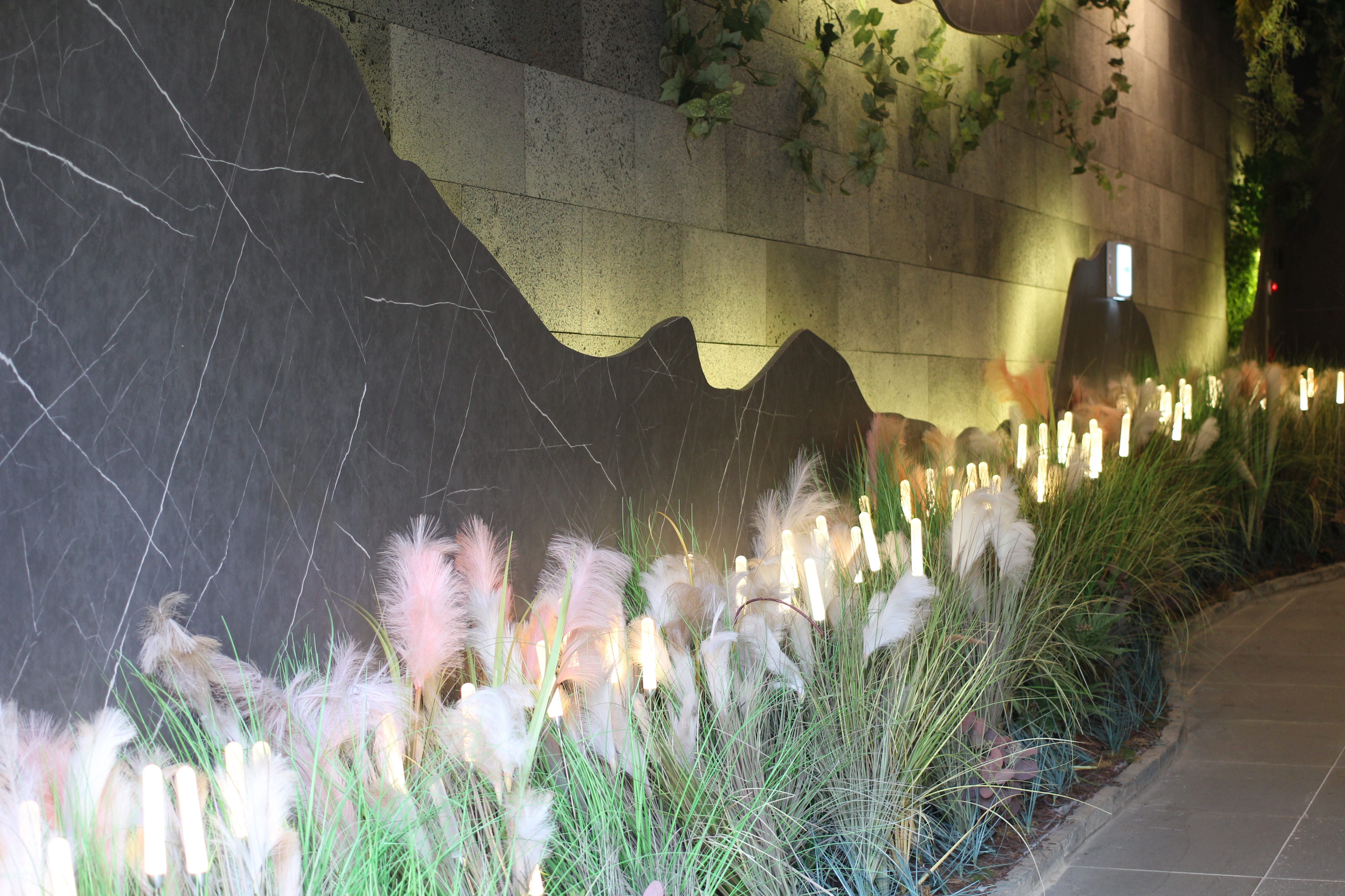 동굴 안쪽은 낮에도 어두운 실내 공간으로 구성되어 있었고, 벽면엔 산등성이 실루엣을 형상화한 물결 모양의 검은 조형물이 이어져 있었어요. 그 앞으로 억새와 팜파스그래스가 풍성하게 자라고 있고, 사이사이에 직사각형 LED 조명들이 꽂혀 있었죠.