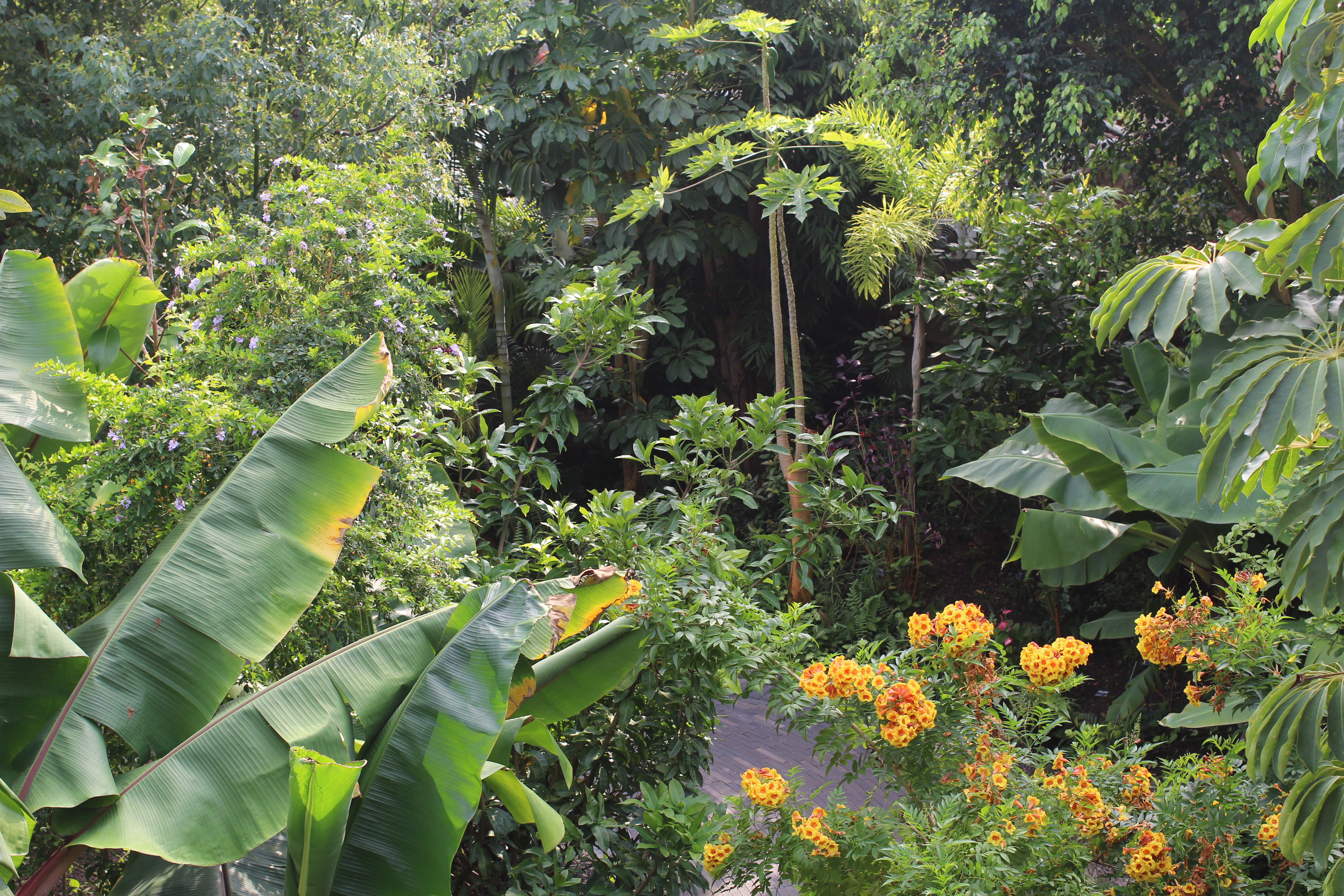 천장의 하얀 구조물이 유리를 지탱하고 있고, 그 너머로 파란 하늘과 산이 보이는 구도는 정말 영화 세트장 같았어요. 산책로를 따라 걷다 보면 어느새 열대 우림 탐험가가 된 기분이 들죠.