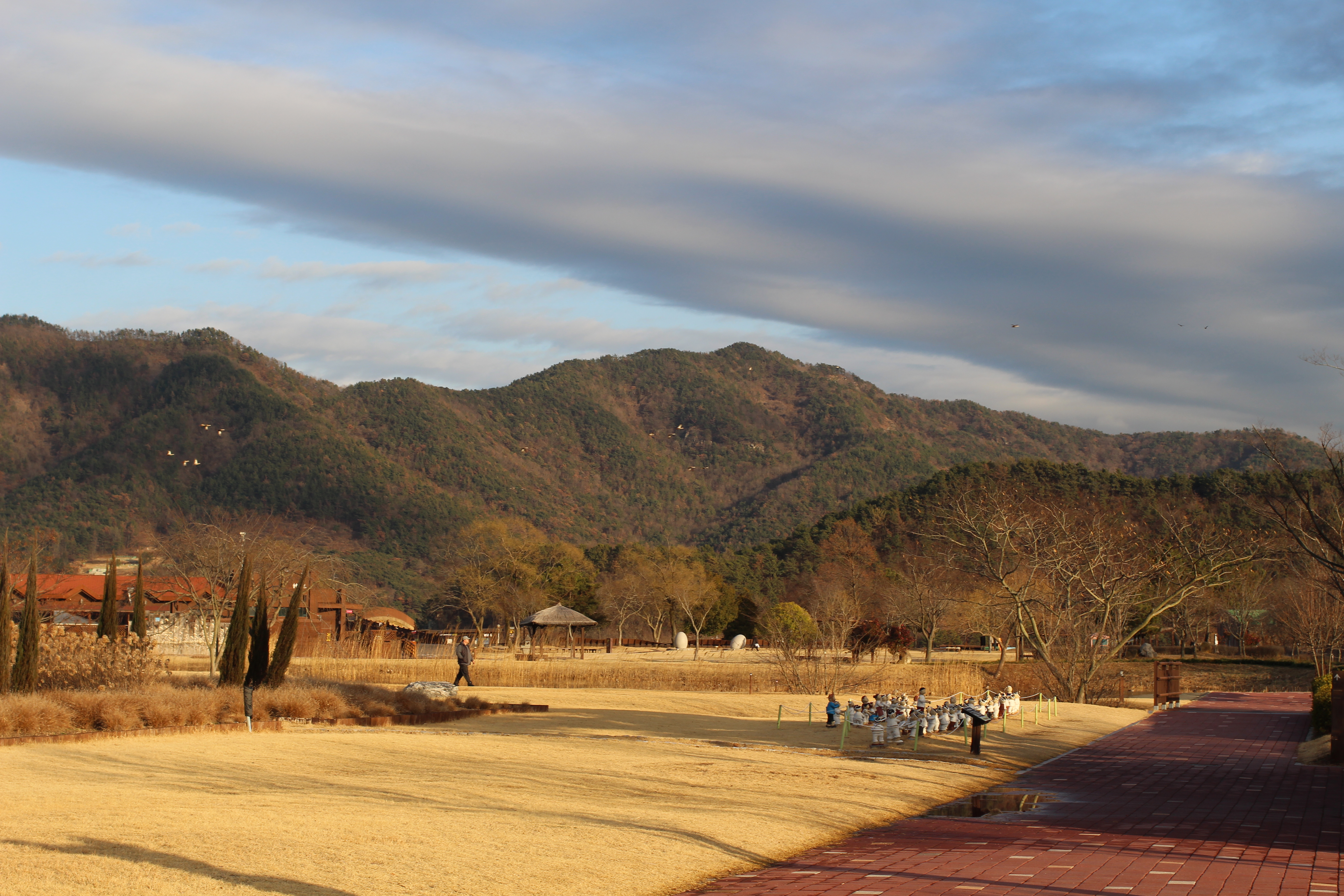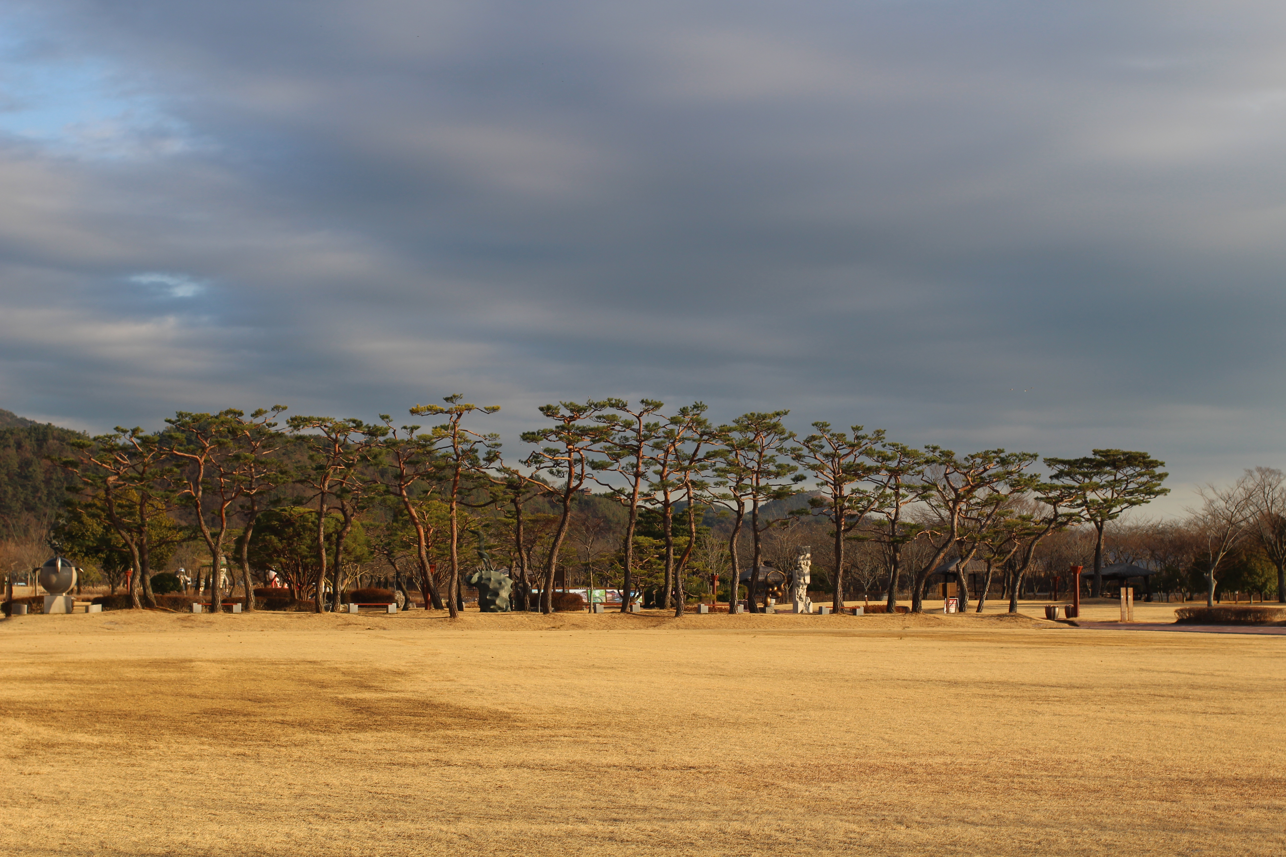 자연생태관 앞 넓은 잔디밭에는 아기자기한 조각 작품들이 곳곳에 배치되어 있습니다. 그 중에서도 전통 놀이를 즐기는 사람들의 도자기 인형이 모인 작품이 특히 정겹습니다. 한복을 입은 인형들이 강강술래를 하는 듯 손을 잡고 둥글게 모여 있는 모습이 마음을 따뜻하게 합니다. 소나무 숲 사이로 난 산책로를 따라 걷다 보면, 겨울인데도 싱그러운 초록빛이 눈을 즐겁게 합니다.