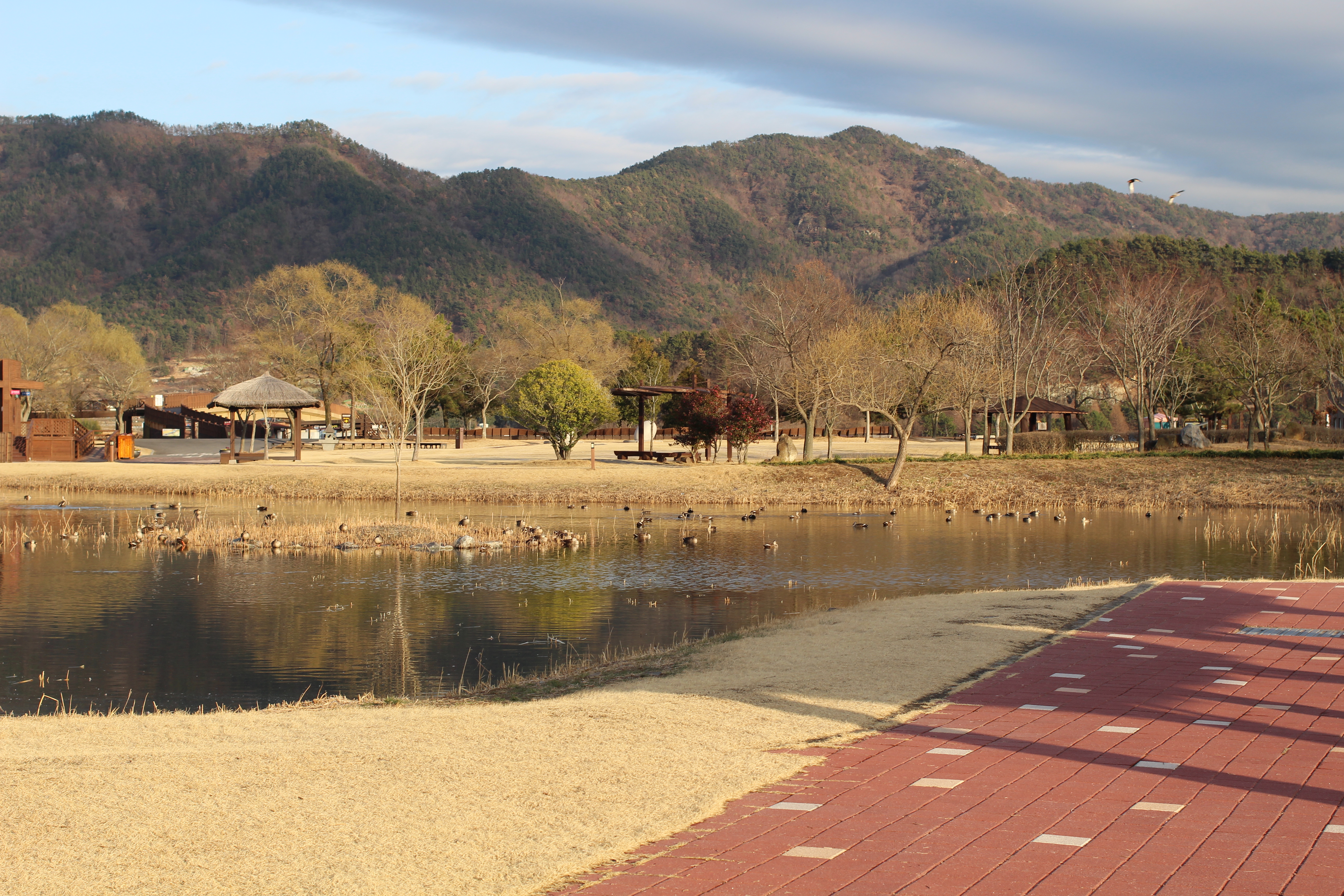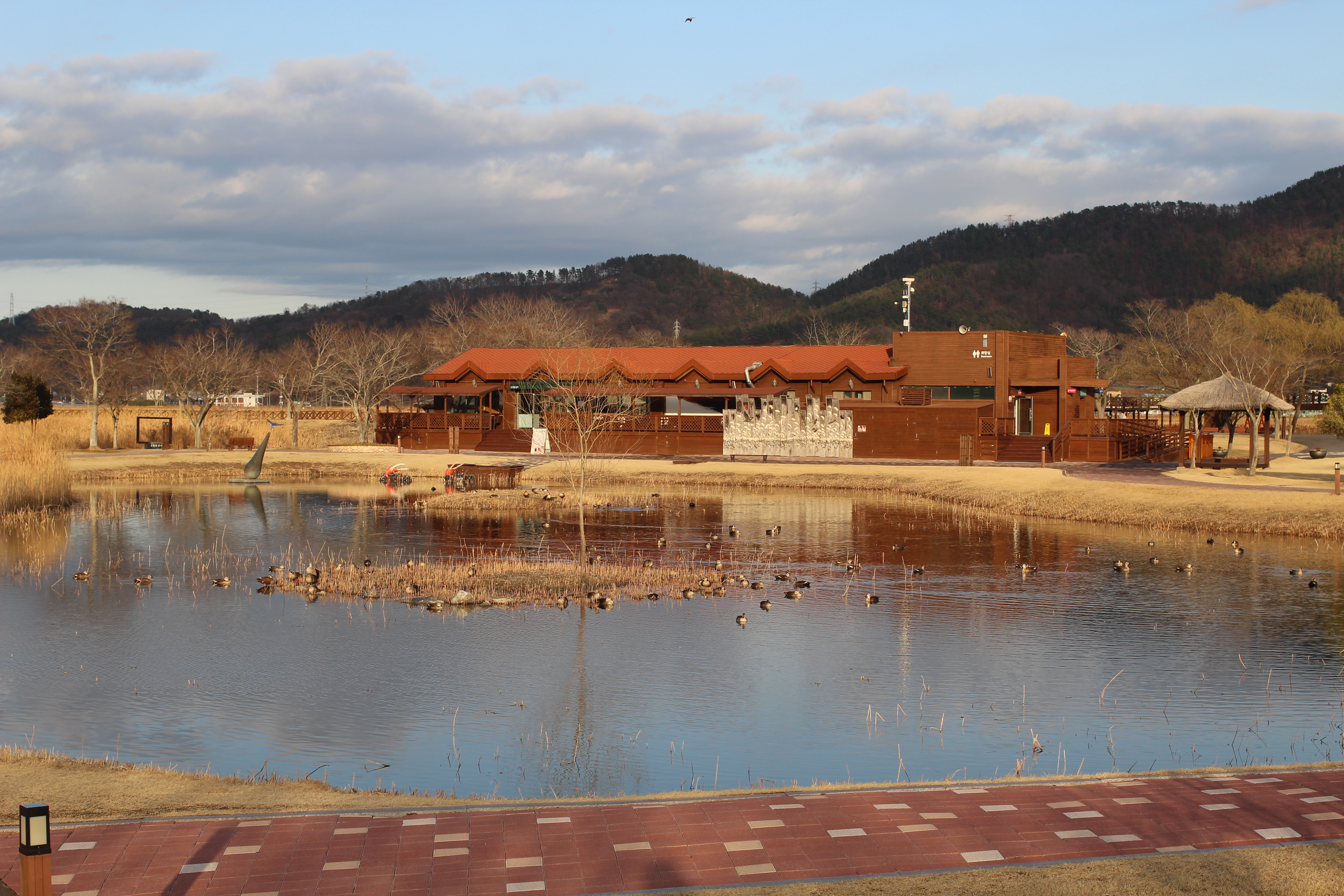 공원 안에는 크고 작은 연못이 있는데, 겨울에도 수많은 오리들이 이 연못에서 생활합니다. 산을 배경으로 붉은 지붕의 건물과 연못, 그 위를 노니는 오리들이 어우러진 풍경은 순천만의 또 다른 매력입니다. 연못 주변에는 탐조 안내판이 설치되어 있어 어떤 새인지 확인하며 관찰할 수 있습니다.