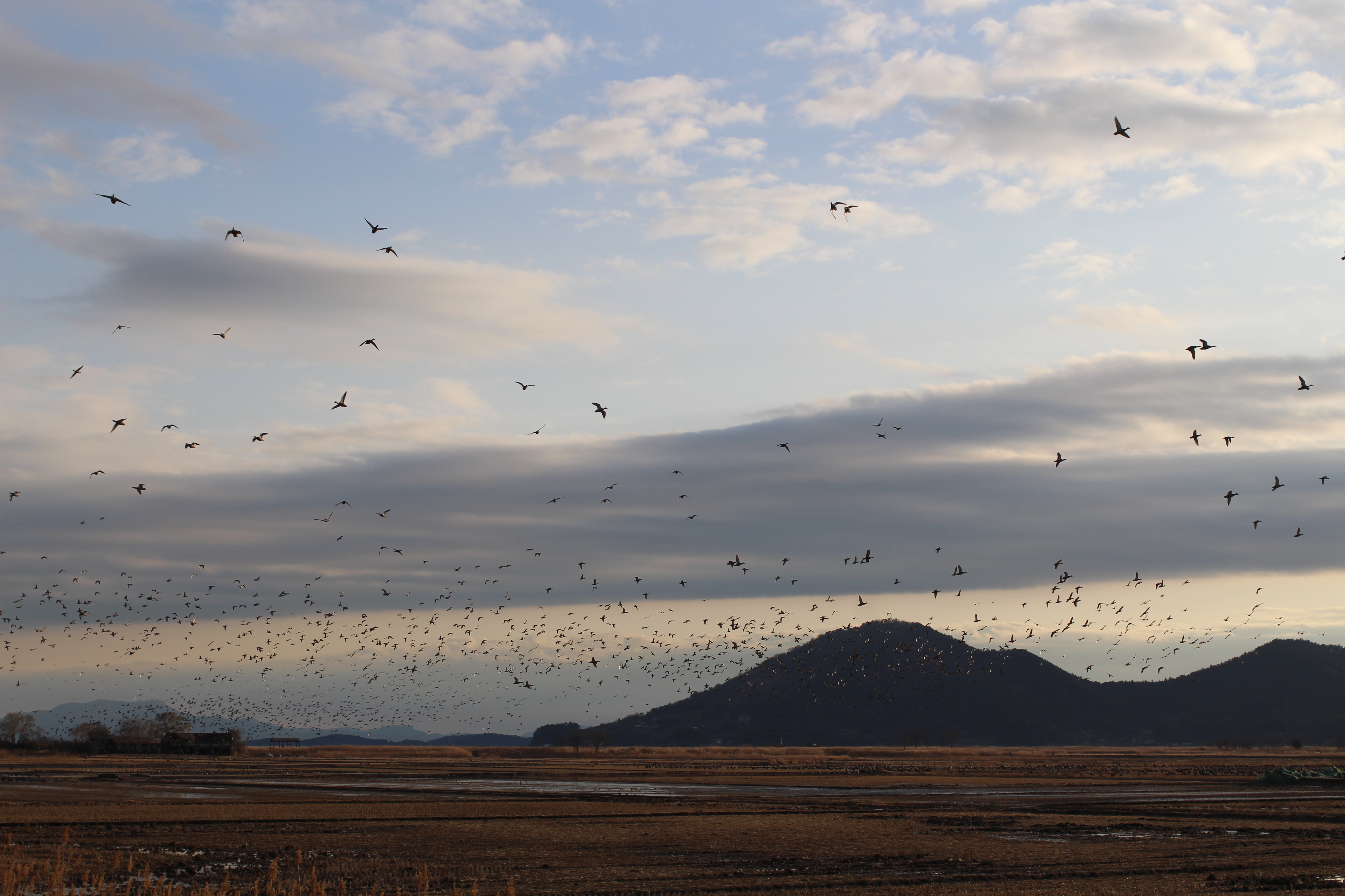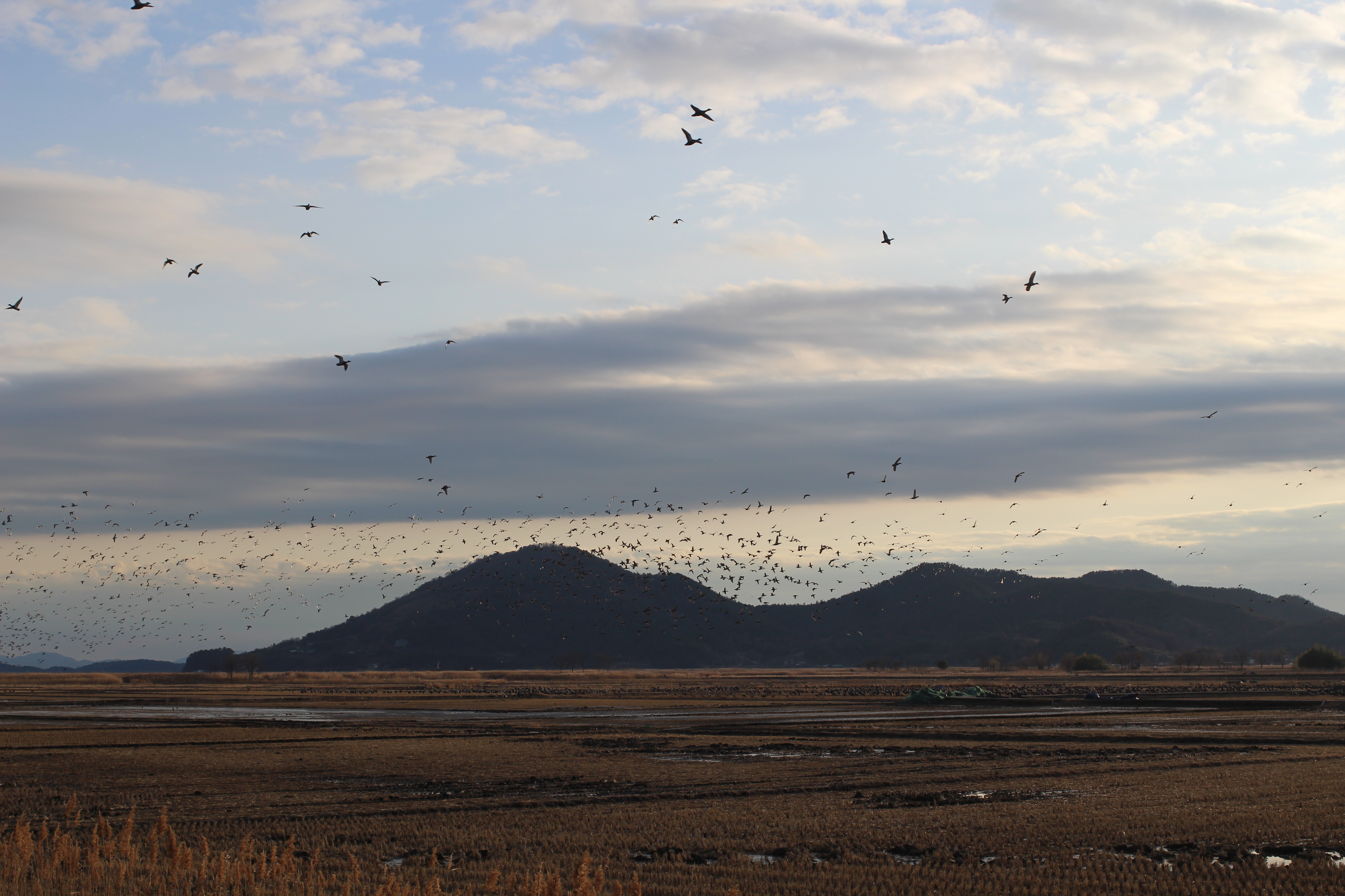 해가 서쪽으로 기울기 시작하면 철새들의 움직임이 더욱 활발해집니다. 낮 동안 논밭에서 먹이를 먹던 수만 마리의 오리와 기러기들이 일제히 하늘로 날아올라 잠자리를 찾아 이동하기 시작합니다.
