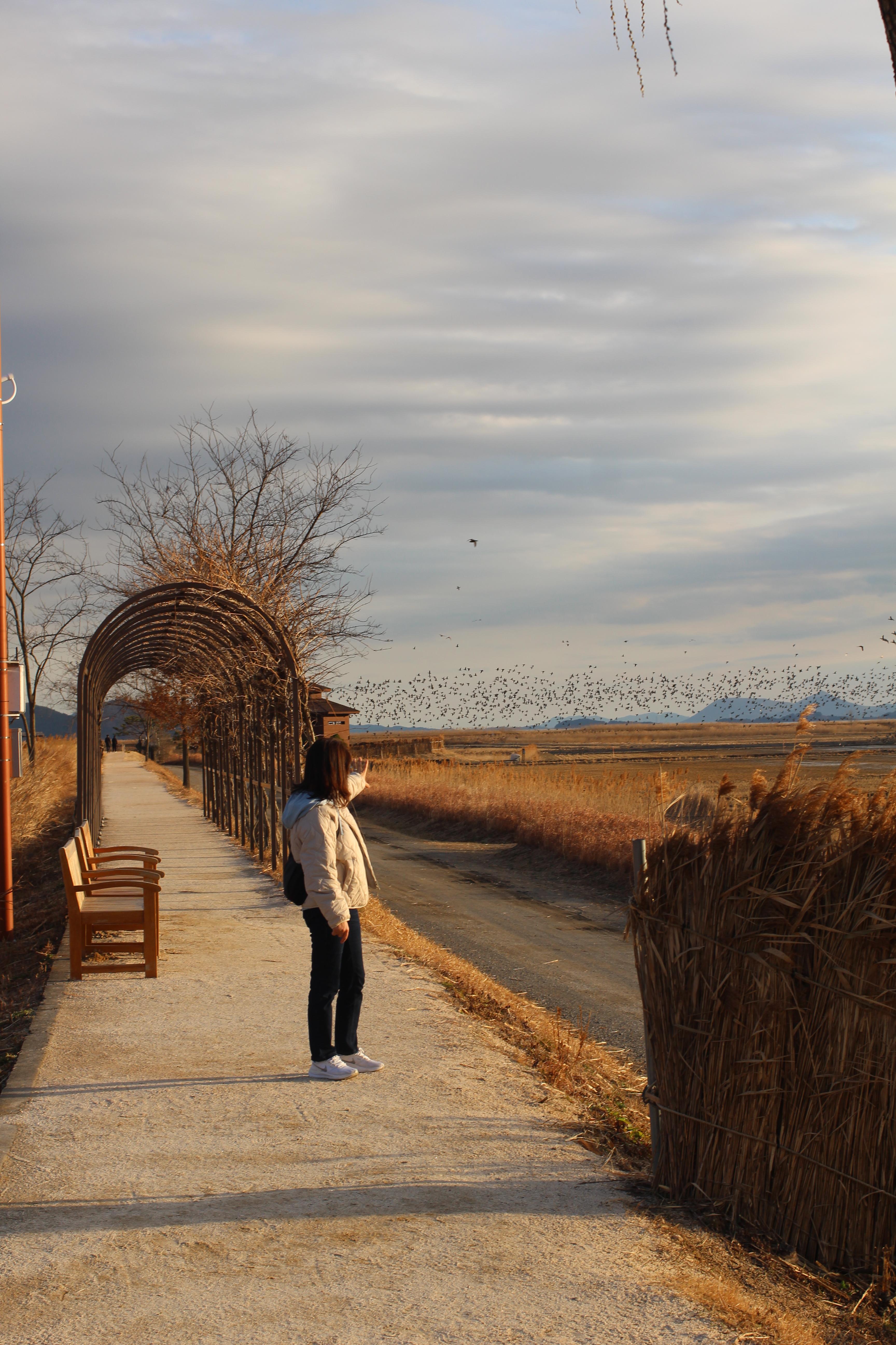 산책로를 걷던 중 하늘 저편에서 수백 마리의 새들이 물결치듯 날아오릅니다. 손가락으로 가리키지 않을 수 없는 순간입니다. 가창오리로 보이는 철새 무리가 황혼이 물들기 시작한 하늘 위로 S자를 그리며 나아갑니다.