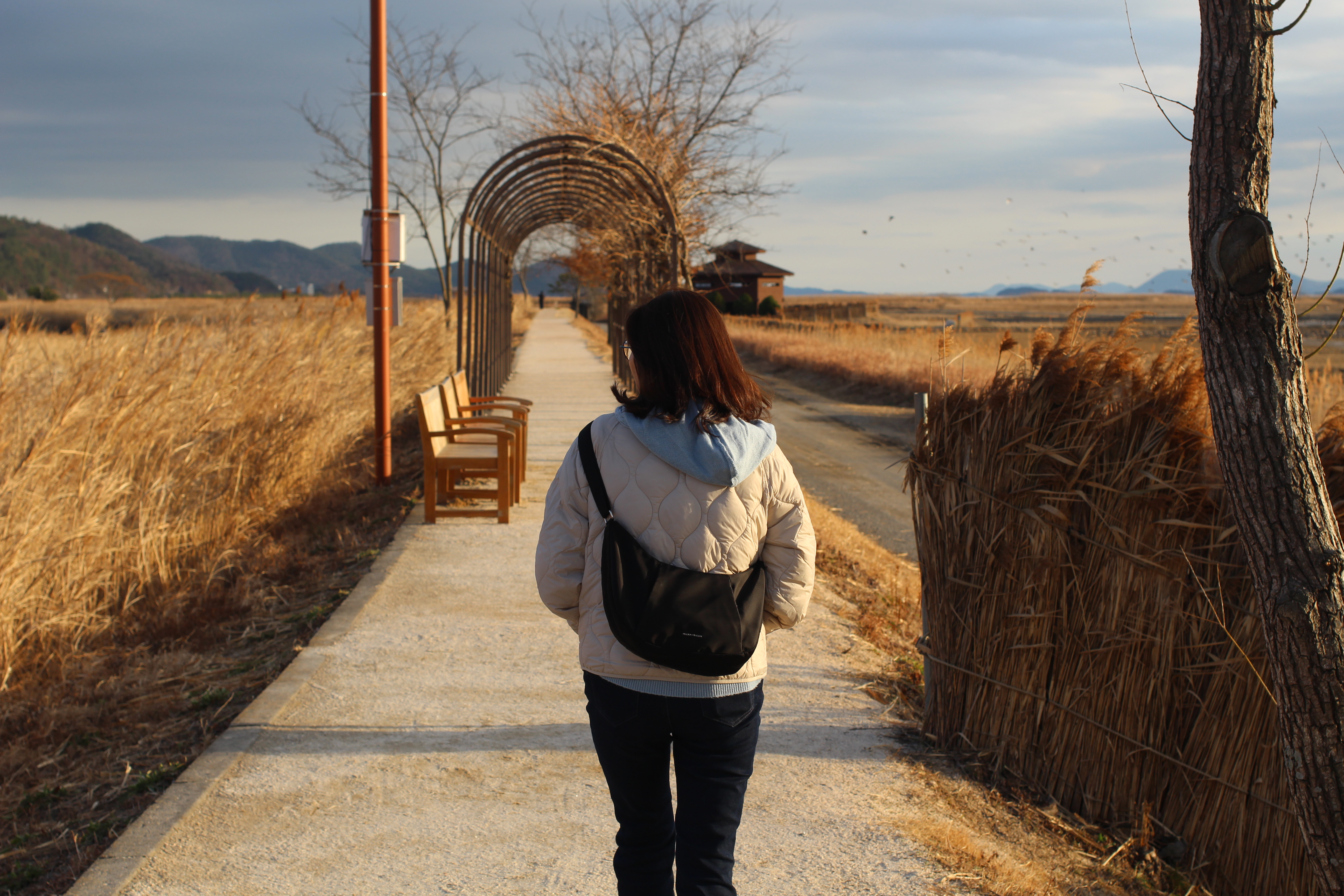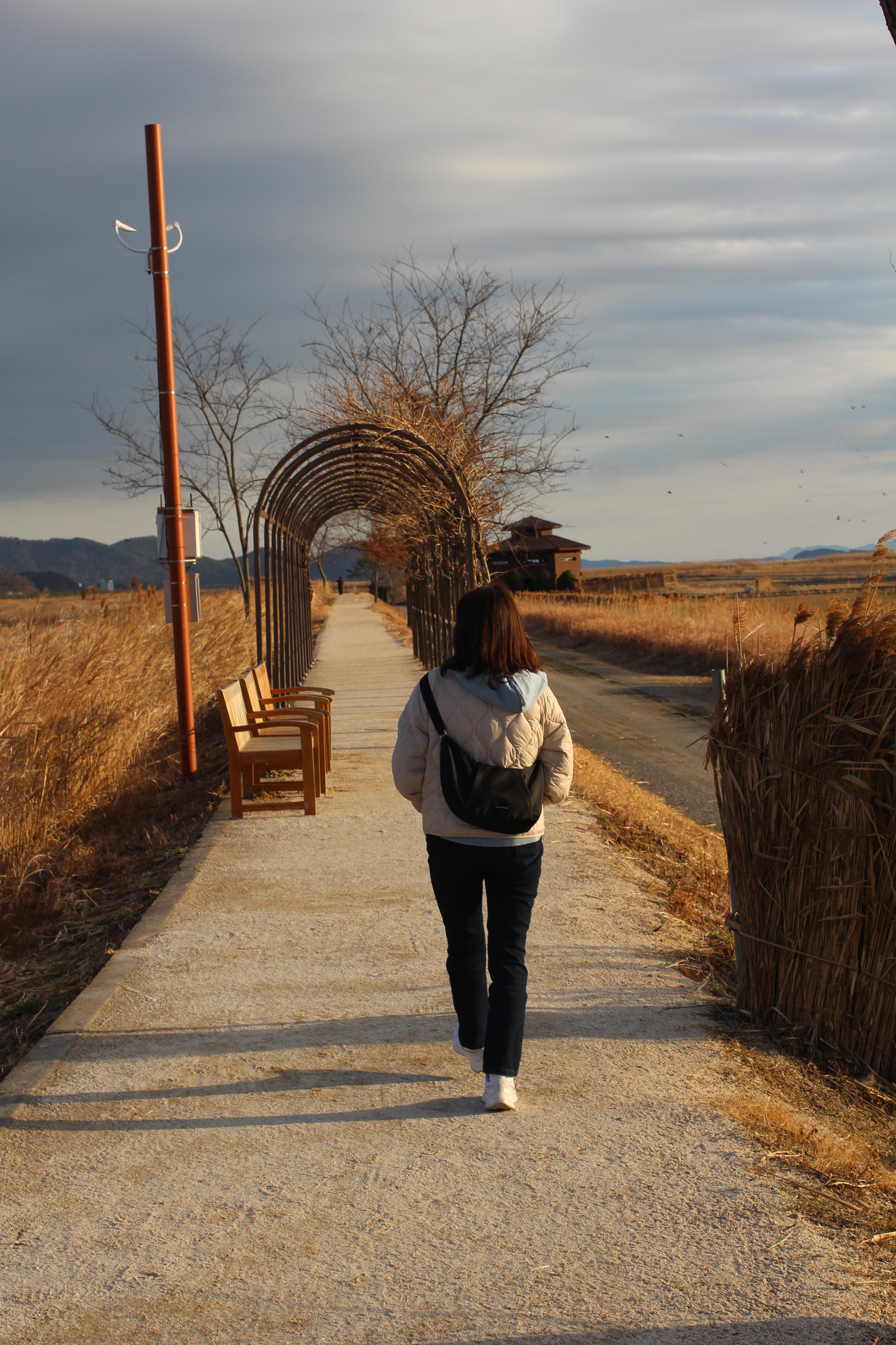 걷기 시작하자마자 탄성이 나옵니다. 황금빛 갈대가 양쪽으로 빽빽이 들어서고, 그 너머로 드넓은 논밭과 멀리 산이 겹겹이 포개집니다. 아치형 나무 구조물이 이어지는 산책로를 걷는 기분은 마치 자연이 만들어준 복도를 지나는 것 같습니다.
