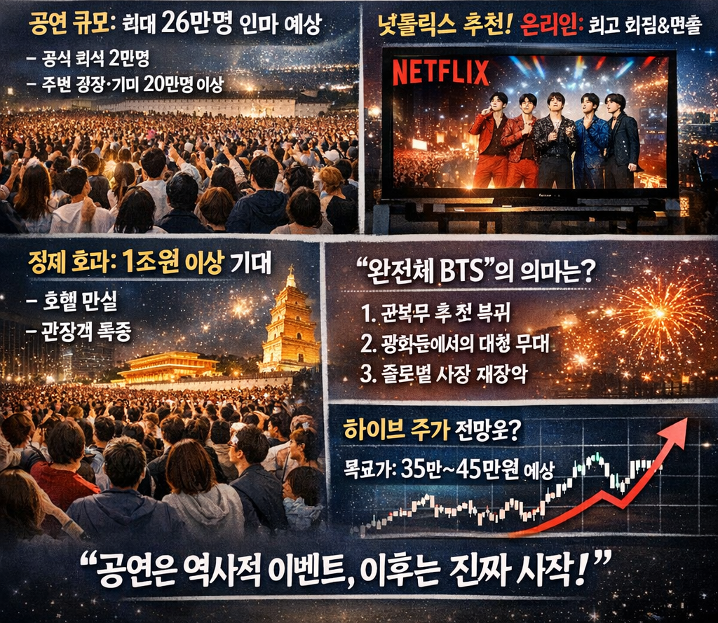 과거 BTS 공연 사례를 보면 수천억~1조 원 이상의 경제 효과가 발생한 적도 있습니다.