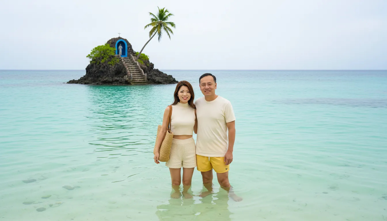 아일랜드 호핑 투어에 나섰다. 배를 타고 조금만 나가면 신발을 벗고 바다 한가운데 서 있을 수 있는 곳이 나온다. 발목을 간질이는 에메랄드빛 물결, 멀리 보이는 작은 섬의 팜트리, 그리고 뒤에 서 있는 성모상. 이 풍경을 배경으로 함께 서 있다는 것이 꿈같았다.