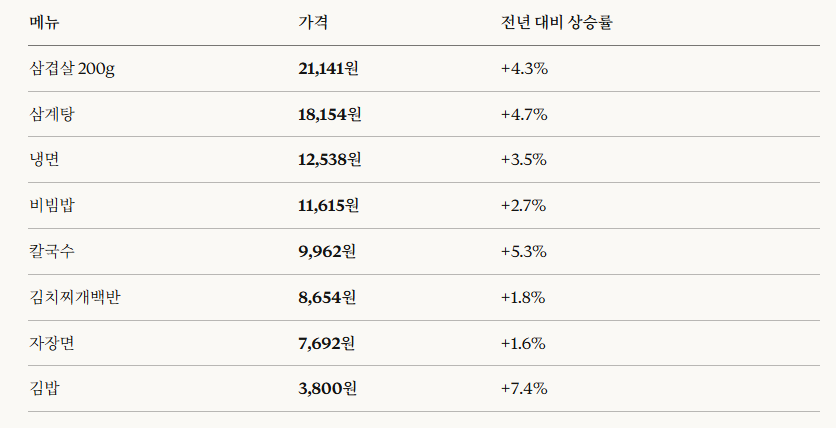 같은 기간 동안 집밥 재료비(식료품·비주류 음료 지출)는 33.1% 오른 반면, **외식비는 37.9%**나 뛰었습니다. 이미지 속 차트 숫자들이 그냥 나온 게 아닙니다.