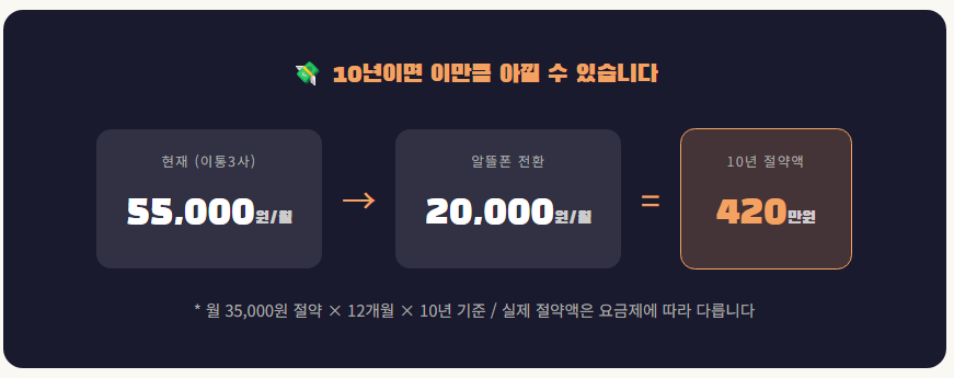 정책 변화를 기다리는 것도 좋지만, 지금 당장 알뜰폰 비교 사이트 하나만 열어도 월 3만원을 아낄 수 있습니다. 10년이면 420만원. 치킨 280마리입니다.
