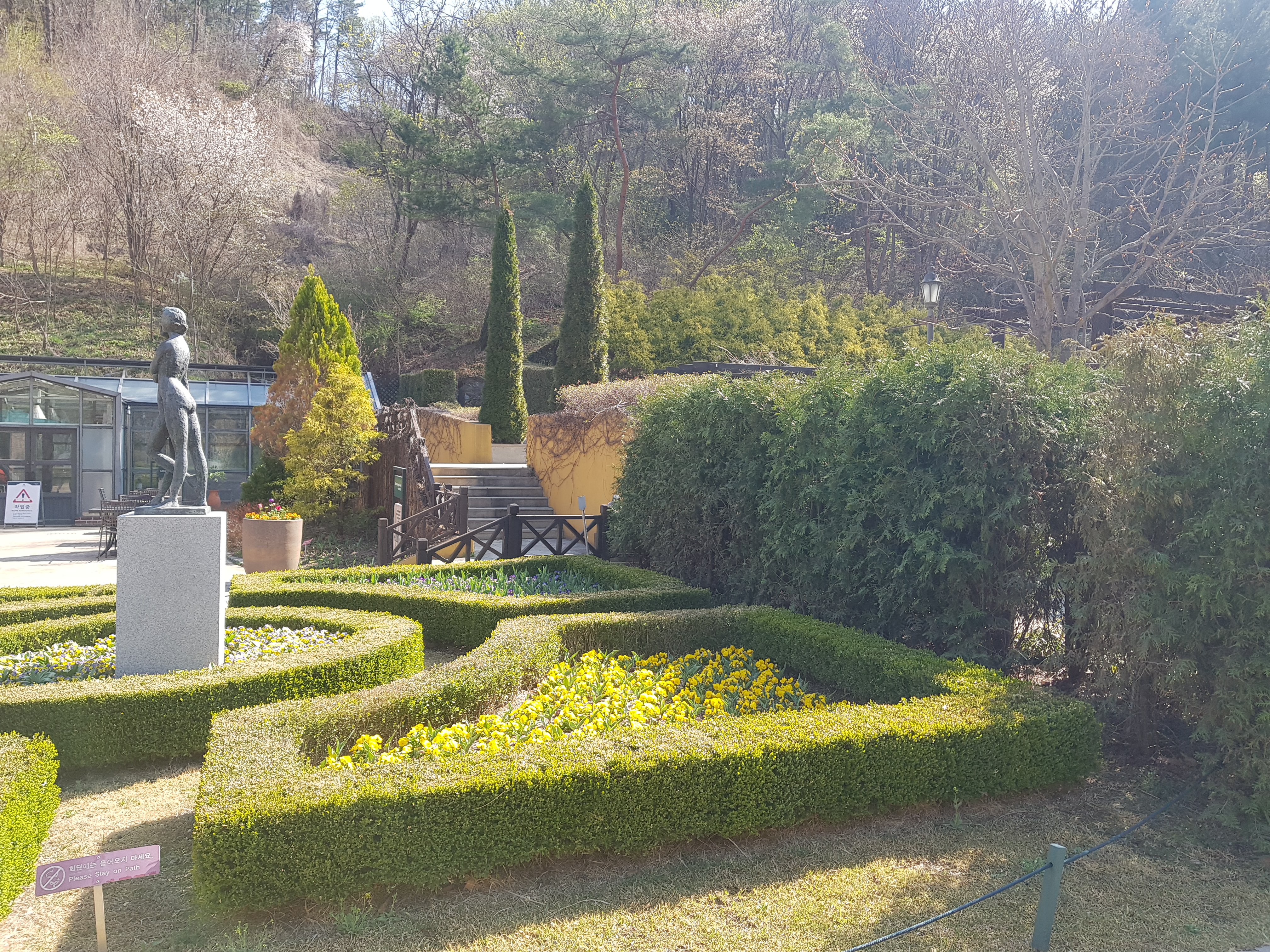 기하학적으로 다듬어진 회양목 사이로 샛노란 봄꽃들이 피어나 있었다. 조각상 하나가 그 한가운데 서서 정원의 중심을 잡아주었다. 배경으로는 키 큰 측백나무들이 하늘을 향해 솟아 있었고, 유리 온실 건물이 반짝이며 빛을 모으고 있었다.