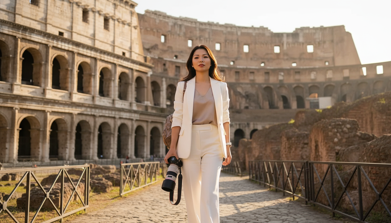 하얀 재킷을 입고 걷는 이 원형 경기장의 바닥—2,000년 전엔 여기서 5만 명이 함성을 질렀을 것이다. 황금빛 석양이 아치를 물들이는 저녁, 콜로세움은 가장 아름다운 얼굴을 드러낸다.