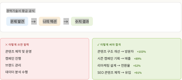 "GA, Photoshop 사용 가능"은 아무 의미 없다. "GA 기반 이탈률 분석 → 17건 개선 → CTR +4.3%"처럼 결과와 연결해야 한다.