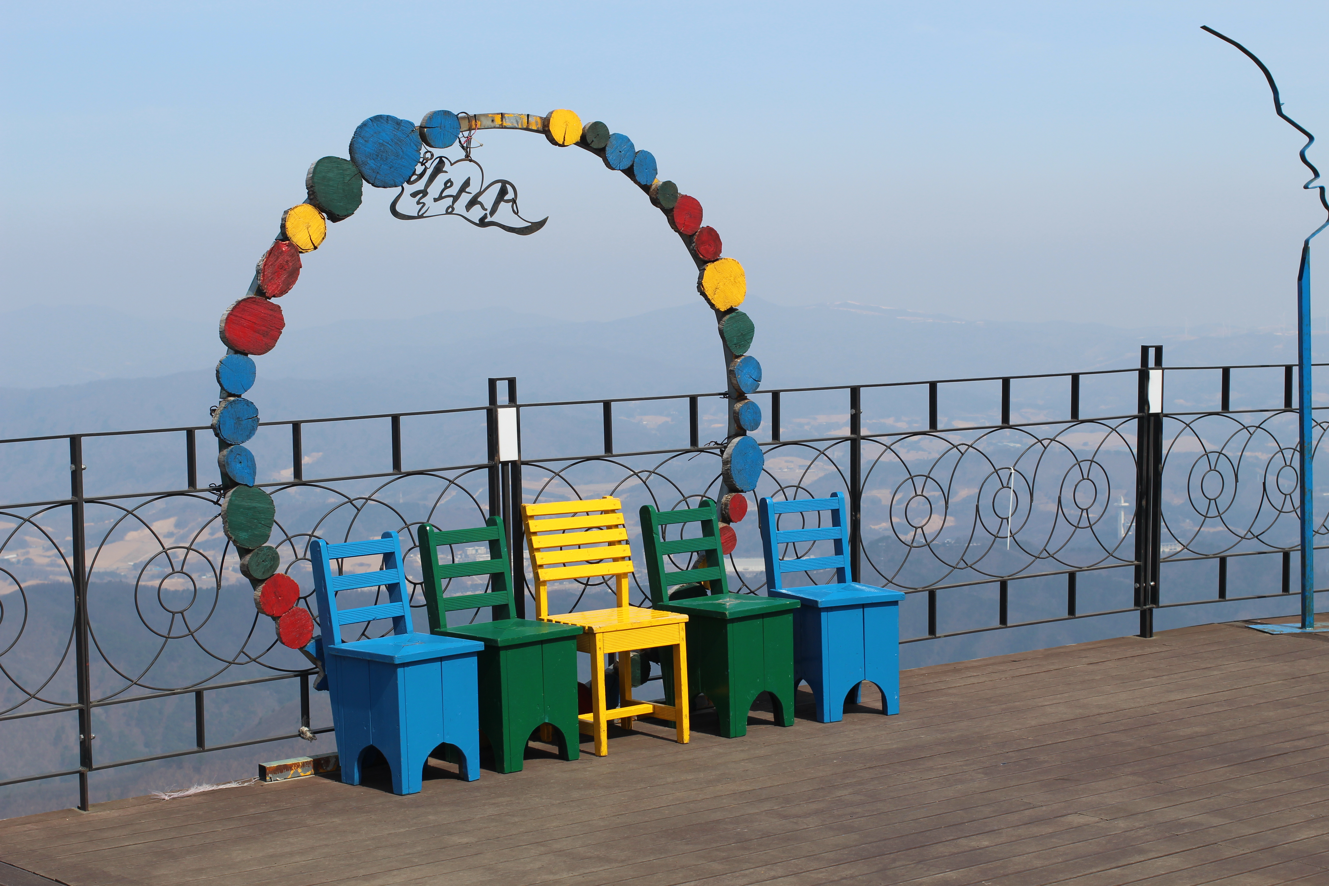 그런데 더 눈길을 끈 건 전망대 위의 설치미술들이었다. 파랑, 초록, 빨강, 노랑의 작은 의자들이 반원형 나무조각 아치 아래 옹기종기 모여 있었고, 바람에 흔들릴 것 같은 추상적인 인물 조형물들이 하늘을 향해 구불구불 뻗어 있었다. 뒤로는 아득한 산줄기와 하늘이 배경처럼 펼쳐지니, 그 자체로 완벽한 포토존이 완성됐다.