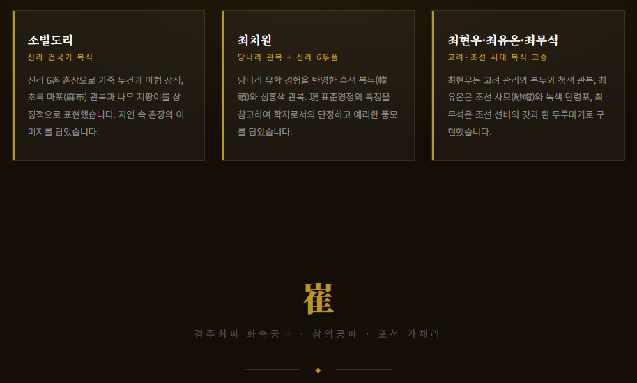소벌도리의 개국정신, 최치원의 학문과 기개, 최현우의 치적, 최유온의 충절, 최무석의 입향… 이 긴 이야기를 온전히 알 때 비로소 우리가 어떤 뿌리에서 자라난 사람인지를 이해할 수 있습니다. 가문의 역사는 살아있는 정신의 계보입니다.