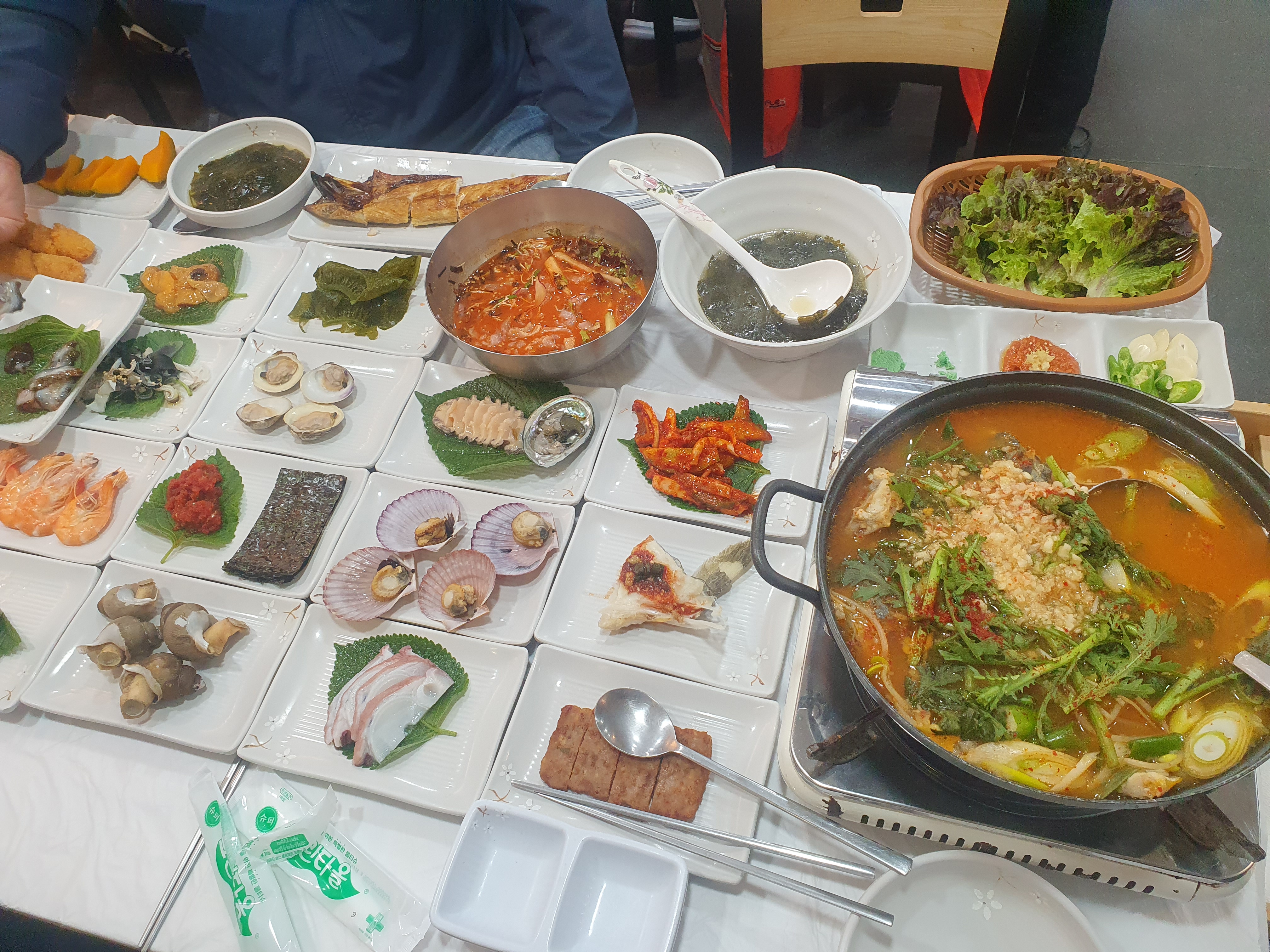 주문진에 도착하자마자 우리를 맞이한 것은 바닷바람이 아니라 뜨거운 매운탕 냄새였다. 식당 문을 열고 들어서는 순간, 테이블 위에 펼쳐진 광경에 모두가 탄성을 질렀다. 하얀 소접시들이 도미노처럼 가득 차 있었다 각양각색의 회와 해산물, 그리고 중앙을 차지한 커다란 냄비 두 개.