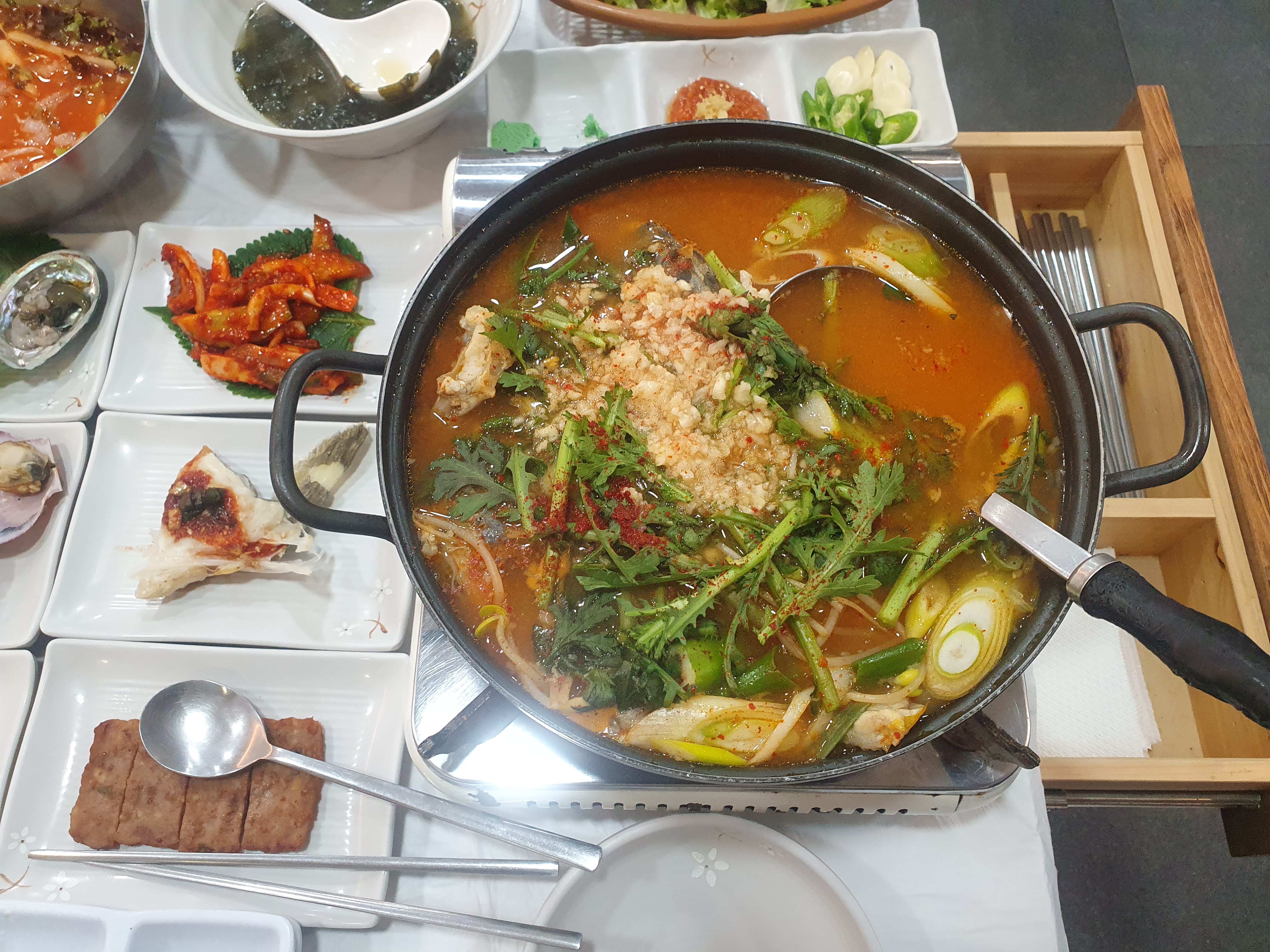 매운탕은 따로 또 같이였다 매콤하고 진한 국물에 생선살이 가득하고, 위에는 쑥갓과 대파가 수북이 올라가 있었다. 숟가락을 한 번 넣자 국물이 불그스름하게 철렁인다. 한 모금 마시자마자 "아, 이게 바다 맛이구나" 싶었다.