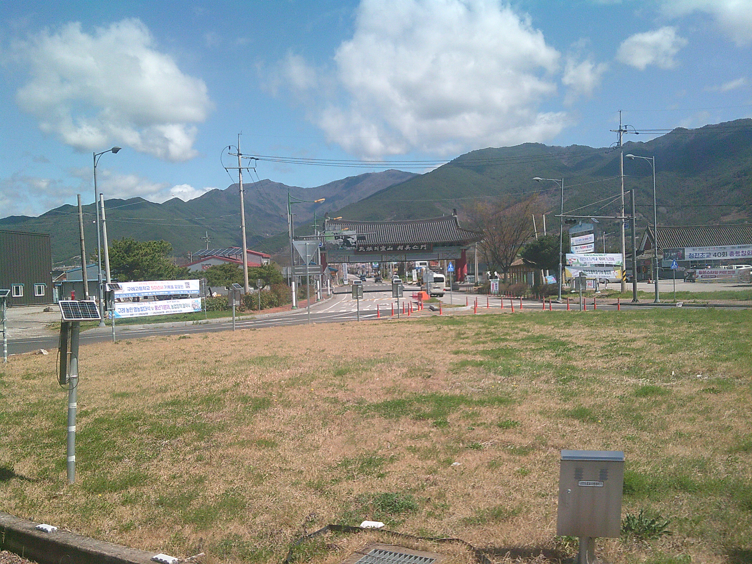 구례읍을 지나며 버스는 섬진강을 따라 달리기 시작했다. 길 양쪽으로 개나리의 샛노란 물결이 펼쳐졌다 — 벚꽃의 분홍과 개나리의 노랑이 뒤섞인 봄의 파레트. 전봇대 하나가 홀로 서 있는 농촌 풍경 위로 봄 구름이 두둥실 떠 있었고, 그 뒤로 지리산 자락이 묵직하게 자리를 지키고 있었다.
