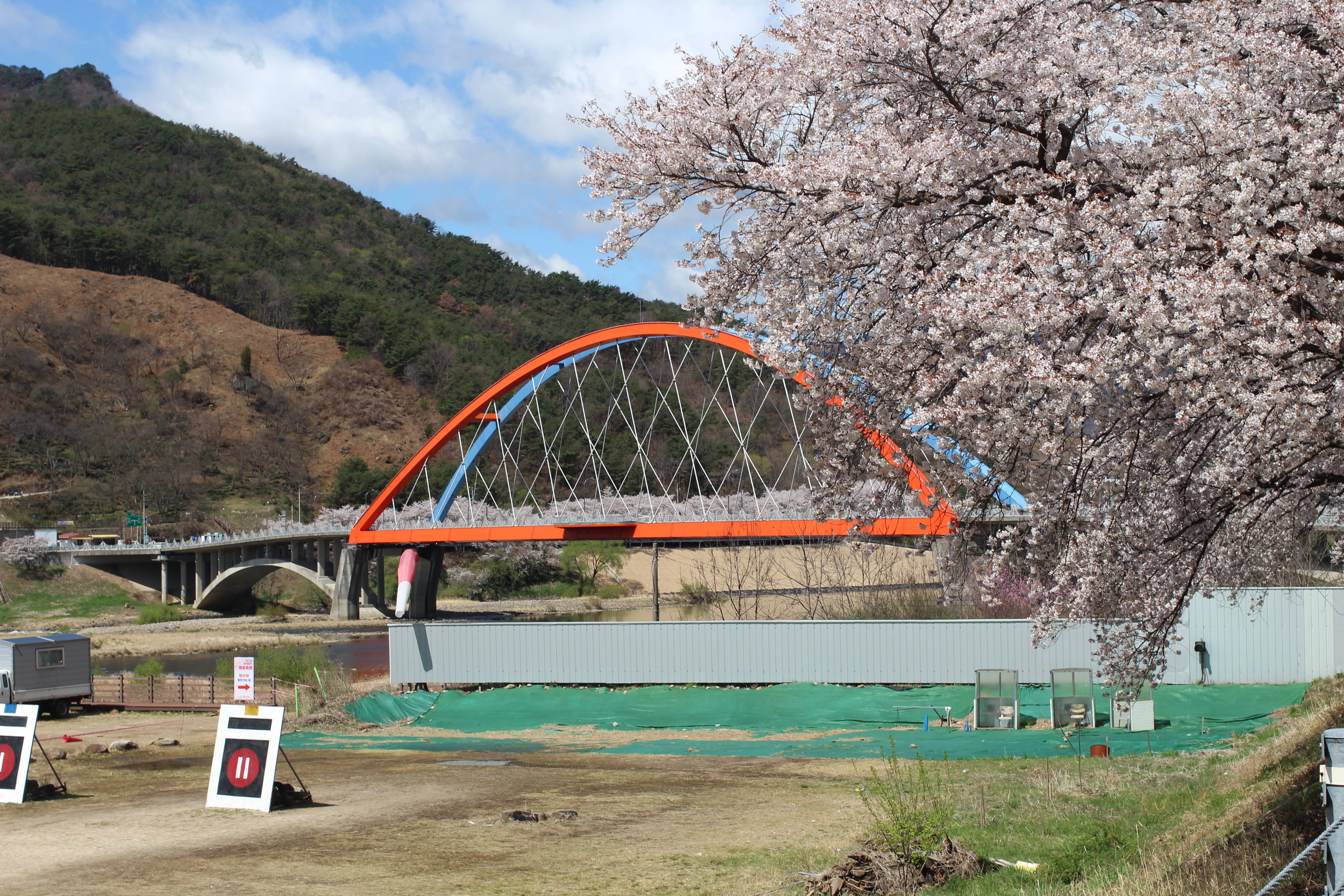 마을에 가까워질수록 카페와 펜션들이 하나둘 나타났다. 비탈을 따라 층층이 들어선 집들, 그리고 길가에 늘어선 래프팅·서바이벌·투명카약 간판들. 아직 봄 초입이지만 이미 관광객들의 발걸음이 느껴지는 활기찬 마을 풍경이었다. 그리고 한 굽이를 돌면 저 멀리, 강 위 다리와 그 위를 수놓은 벚꽃 화개장터가 손짓하고 있었다.